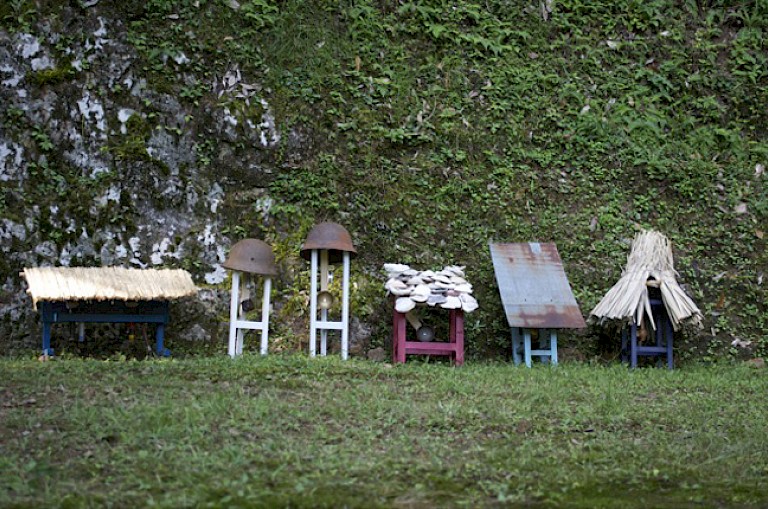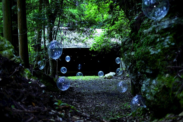Mori Butai consisted of several events, including a photography competition and exhibition, kinetic sculpture workshops with school children, and public art installations within several sacred shrine-stage complexes in Tokushima Prefecture on the island of Shikoku. Given its emphasis on nature, it should come as no surprise that the project explored ecological themes. The school workshops, for example, taught children how to make electricity-generating wind wheels by recycling PET bottles. Similarly, the public art installations focused on sustainability issues. Situated in shrines in the Haigyu area and along the Momiji River, these sculptures incorporated local materials such as paper, flower petals and on-site audio recordings. Many effectively revitalized disused stages, exploiting their dilapidated condition to evoke feelings as well as a sense of the passage of historical time.