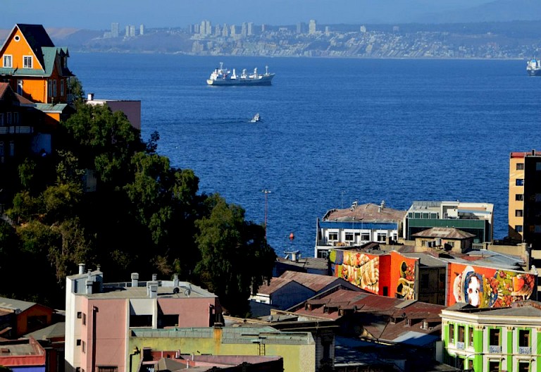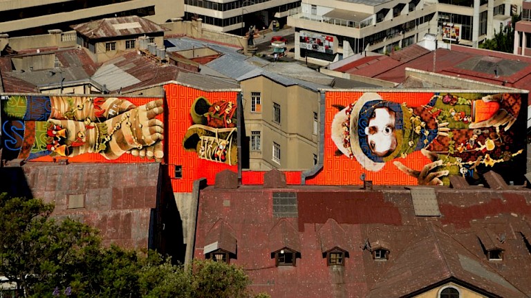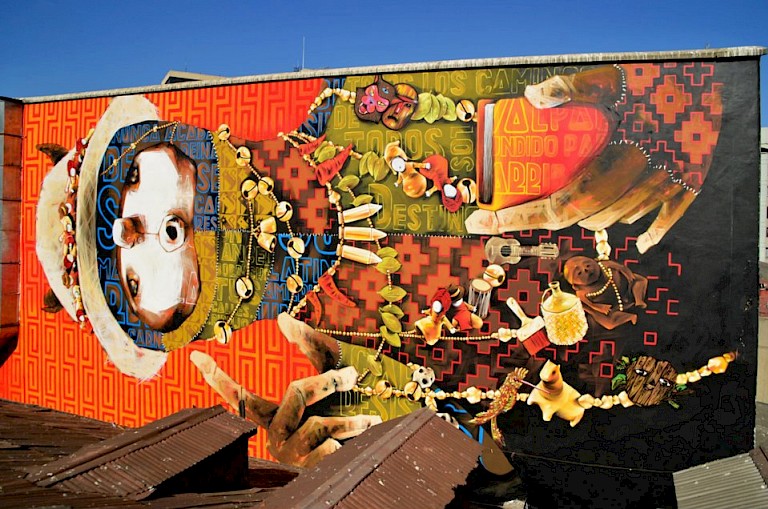 It was the National Arts and Culture Council and the City of Valparaiso who invited him to do the mural. Typically, INTI does not accept commissions since he likes to have complete control over where and what he paints. After some negotiation however, this particular location became his ultimate choice and he produced this mural during the Festival of the Arts in 2012.INTI’s murals are well known internationally for their combination of elements derived from Latin American indigenous and popular cultures and the incorporation of contemporary political and territory-specific elements.In this mural the artist particularly evokes Kusillo and Ekeko. Kusillo is the native buffoon who dances without planning and often uses improvisation and Ekeko is the God of prosperity. In this three-part mural, INTI combines the two characters and the clothing includes his signature multi-cultural references from all over Latin America. In an interview, INTI says he did not want to generalize about Andean culture, but rather to make a personal comment about his Latin-American roots. Ekeko and Kusillo combine popular elements as a way to wish the best in life to Latin American people, without losing their spontaneity and reminding everybody of their origins.