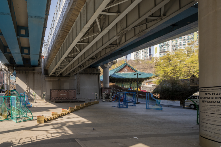 ‘1000 arts 1000 acts’ plans place-making projects for dead spaces underneath highway bridges in 3 different districts of Seoul, South Korea. Each project invites a designer group, installation artists, and performance artists for its various contexts. Corresponding to the new normal of the Covid era, they explore a new form of community and the publicity in art. The project <New Play, New Connection, New Normal> takes place in 2021 in 3 foundations of Oksu, Hannam, Emun districts in Seoul. As a start-off, they firstly conduct a project to suggest new ways of playing in the public space within the social distancing in Oksu where the foundation is in a form of a small square. The project consists of on/offline projects including playful installations of collective artists ‘Junk House’.