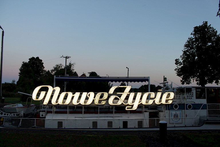 In Lublin, the city in the east of Poland, New Life was placed in the so-called Theatre Under Construction, that had remained unfinished for many years — later the building got completed, currently hosting the Centre for the Meeting of Cultures (Centrum Spotkania Kultur). In Bytom, a town in the south of Poland, New Life was installed next to the former mine — there, it was a core piece of the participatory project that involved local children. In Gdańsk, the port city in the north of the country, on the Baltic coast of Poland, the work was placed in the shipyard. In July 2016, the neon sign was taken on a journey to the exhibition "Common Affairs. Revisiting the Views Award — Contemporary Art from Poland" prepared by Zachęta Narodowa Art Gallery, Deutsche Bank KunstHalle and Polnisches Institut Berlin. The work was transported by the International Waterway E70 from a small river port in Nakło nad Notecią to Berlin on the ship called Łokietek that belonged to the School of Inland Navigation in Nakło. The six-day trip was presented as a symbolic artistic act and thoroughly documented. The film New Life, created in the process, is a 45-minute observation of the changing landscape, seen from the perspective of the river, forming a spontaneous, sensational record of the journey.