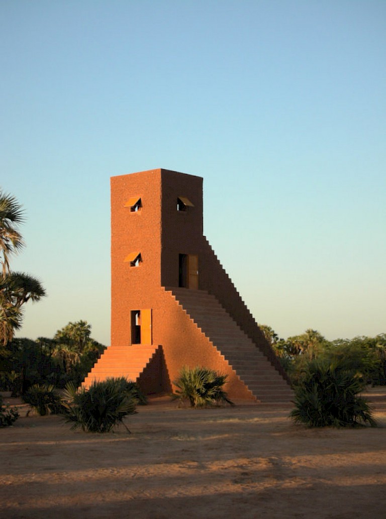 To offer some detail, the House to Watch the Sunset (2005) has three floors, each with its own outside staircase. “The purpose of the structure invokes the 18th-century romantic sublime notion of allowing oneself to be totally absorbed within nature. To build a house whose sole function is to watch the sunset, the spectator moving from one level to the other with the changing height of the sunset, is poetic and transcendental. Furthermore, there exist ancient influences informing House to Watch the Sunset. The concept of the house, in contrast with the sophisticated minimalist form, is archaic and pagan in its almost worshipful dedication to nature, of the sun in particular,“ writes Alma Zevi.