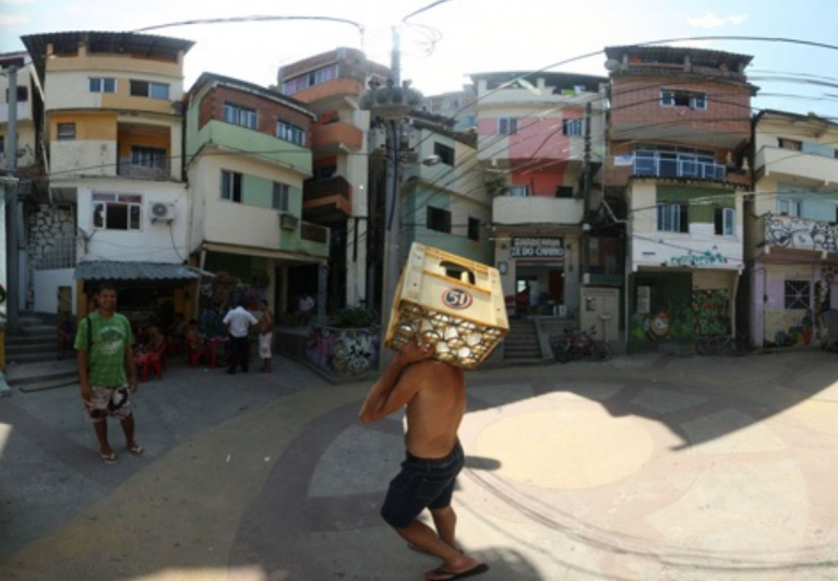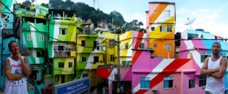 The successes of these initial projects in Vila Cruzeiro inspired the O Morro project in Santa Marta, a very large favela community in Rio de Janeiro. The hillside community is prominent and visible from many viewpoints in the city because of its location between the famous geographic landmarks and tourist destinations Pão do Açucar (Sugar Loaf Mountain) and Corcovado, which has the giant Cristo Redentor (Christ the Redeemer) monument on top. As seen from the attached before image, the artists selected an ordinary, rather nondescript plaza in the heart of Santa Marta.