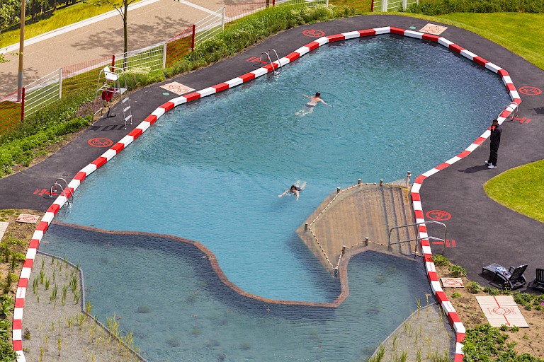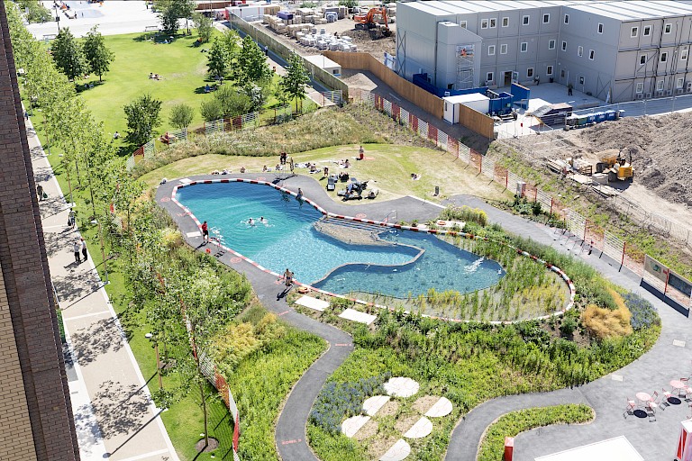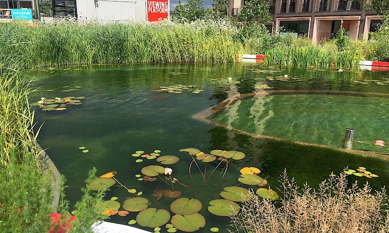 Of Soil and Water: King’s Cross Pond Club is an art installation in the form of a natural bathing pond, at Lewis Cubitt Park in the King’s Cross development site, London and is designed as a collaboration between Berlin based Slovenian artist Marjetica Potrc and Dutch based architects Ooze (Eva Pfannes and Sylvain Hartenberg) (they have worked together on several large scale collaborations). Potrč's interdisciplinary practice includes on-site projects, research, and architectural case studies. Her work documents and interprets contemporary architectural practices in particular with regard to energy infrastructure and water use and the ways people live together. Her work has developed at the intersection of visual art, architecture, and social science.