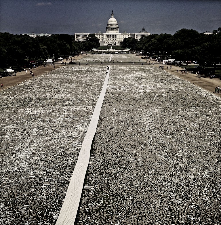 Created by artist Naomi Natale, the project is a large-scale social art work combining education, hands-on art-making, and public installation to raise awareness of ongoing genocides and atrocities in places like Sudan, South Sudan, the Democratic Republic of the Congo, Somalia and Burma. The project involves students, activists, artists and educators from all over the world, as a form of collective call for awareness and action. More 1,000,000 handcrafted bones were collected over a period of 3 years, for a three-day installation event on the National Mall in Washington, D.C., in 2013. The installation existed as a collaborative site of conscience to honor victims and survivors, and will also serve as a visual petition against ongoing conflicts and a resounding call for much need and long overdue action. The project was developed with a series of programming and parallel activities: speaker series, performances, educational workshop and created an open platform for remembrance and spirituality.