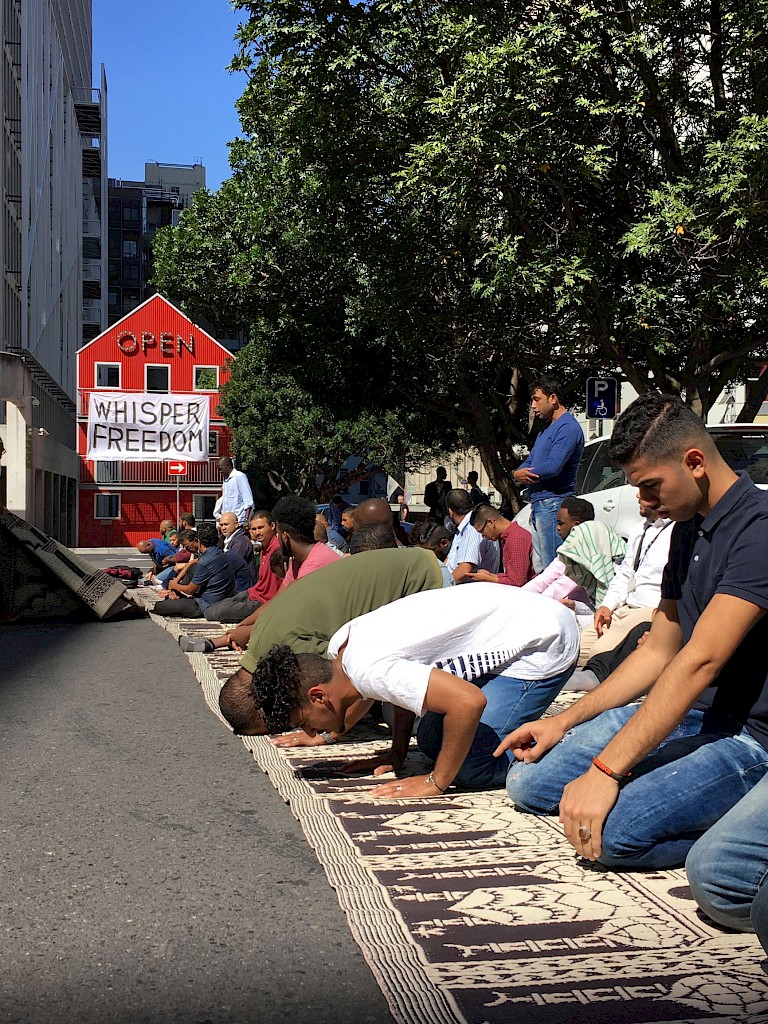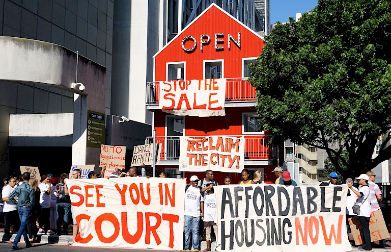 A very intriguing aspect of this public artwork is the way, since inception, that it has been creatively appropriated by the public towards mixed ends. One high-profile example was when an activist organisation, Reclaim the City, which engages towards more equitable housing and associated rights, turned the Open House into a protest site. Passing by on a recent visit, the sculpture had been turned into a makeshift DJ performance venue with an audience gathering in the open space behind the facade structure to listen in. The artwork is situated on Long Street, which for decades has arguably been Cape Town's most lively central street with a busy and mixed-use setup. Another striking element regarding the more formal aspect of the work is how it appropriates into its construction elements government-built housing materials. This mimics how these so-called matchbox houses are themselves often informally extended or adapated by their owners for mixed-use benefits. The sculpture is also playful, taking its cue from its surrounding architecture and context in order to boldly proclaim its presence and allow for a multitude of re-imaginations.