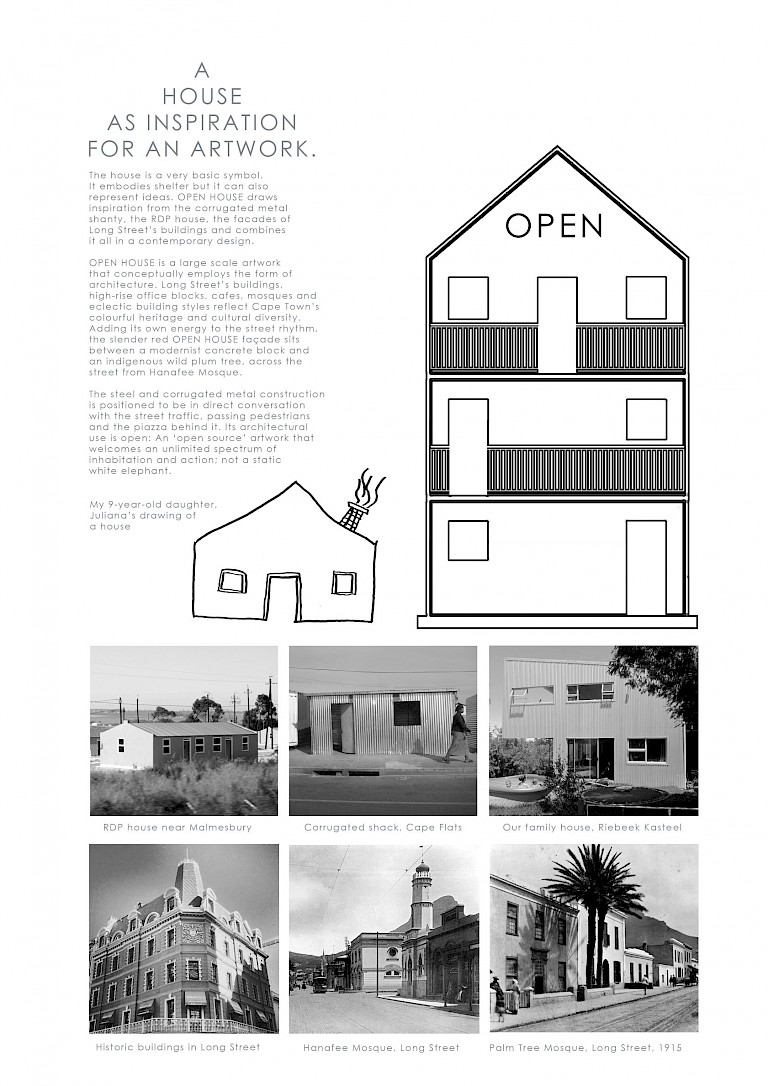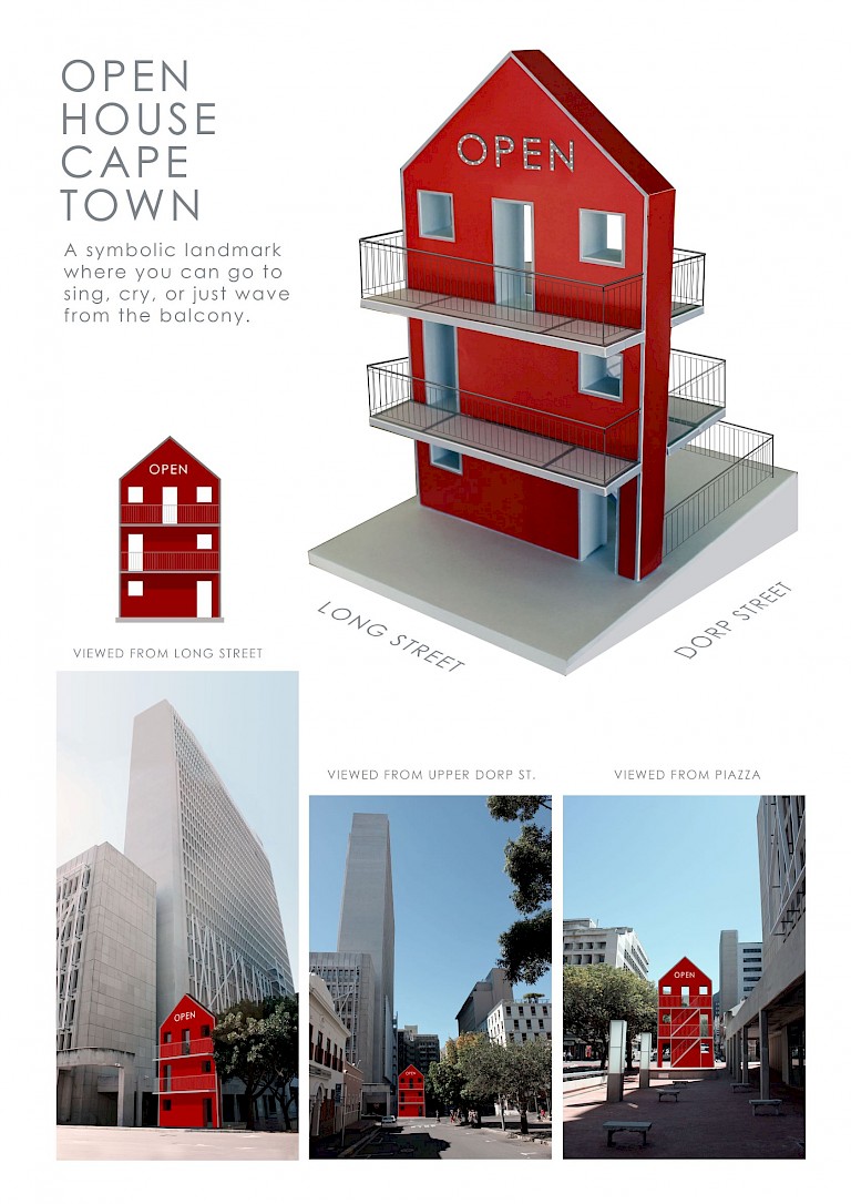 This public art project takes the form of the facade of a house erected in a busy main road in central Cape Town, for people to use as a public space for shelter and for ideas. It is conceived as an 'open source' artwork that welcomes inhabitation and action; to this end it has firm foundations and a balcony with a communal area behind its facade. The public artwork was the result of an open competition run by Cape Town's government office. The artist took inspiration in its design from government-built social housing structures among other elements. It is offered as a place to just sit or meet, for artistic performances or as a speaker's corner.