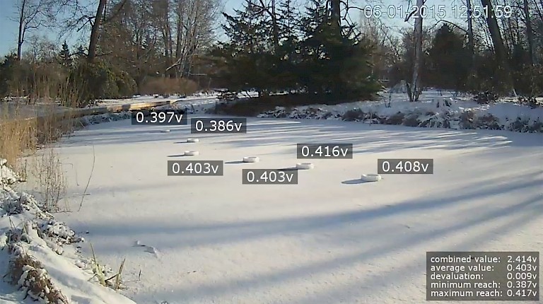 Pond Battery is, in its turn, a project composed by different actions, mediums and spaces, evolving in further forms and outcomes: the installation of little objects-sensors on the surface of the botanical garden’s pond in Riga, a time lapse video of 10 minutes which “visualises the electrical energy generated by MFC (Microbial Fuel Cell) in outdoor conditions during seven month time period from September 2014 to March 2015; and a time lapse video, complemented by a sound composition which interpret recorded internet camera images and data from the fuel cell monitoring during the seven month long observation period, as artists describe.