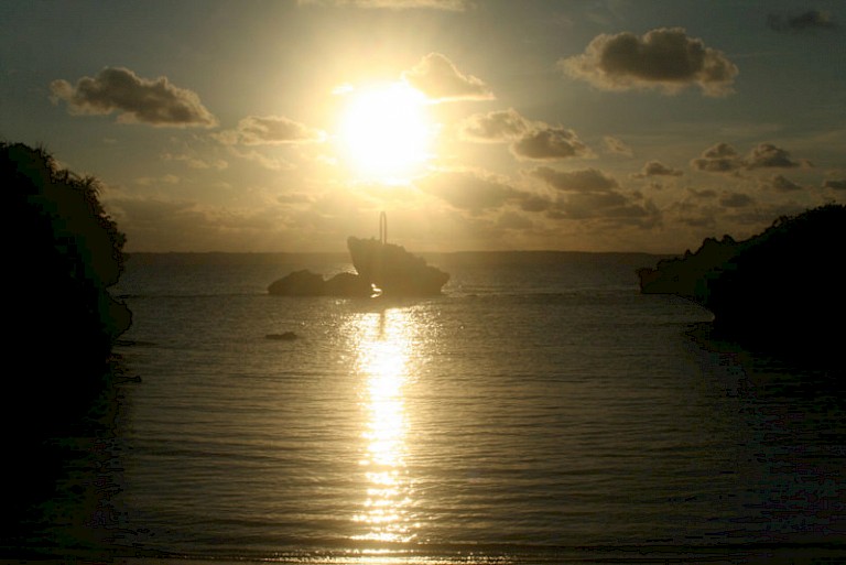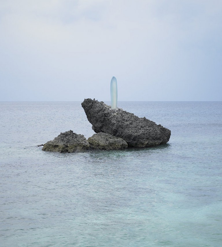 As a site-specific work for the remote and unspoiled landscapes of Miyako Island, Primal Rhythm evokes the fertility rites of ancient cultures and highlights an existing and delicate balance between humanity and nature. Reminiscent of pagan Celtic and other ancient cultures whose lives were controlled absolutely by the seasons and who marked their change with communal rituals, Mori has built a monument that is oriented towards major celestial events. Mori has chosen exact coordinates for her work on Miyako Island so that at the moment of winter solstice, the lengthening shadow of the “sun pillar” will penetrate the moonstone installed in the bay, uniting the celestial with the terrestrial, the masculine with the feminine. An allegory of fertility, Primal Rhythm: Seven Light Bay acts as an important signifier of rebirth and life in a region and country shattered by recent events.