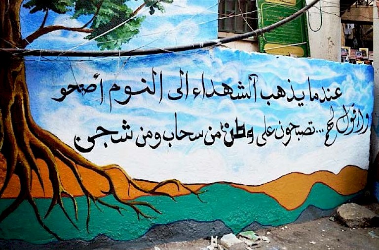 The term ‘camp’ is only used to describe the concrete buildings that would otherwise be validly termed as towns, because the residents are refugees. The idea of these settlements being camps evokes the constant dream that the residents may one day be able to ‘decamp’ and return to their homelands. This train of thought was effectively addressed by Art Forces in the manner in which the murals were collectively created, and provided a public ownership of art that was publicly relevant to that particular community.