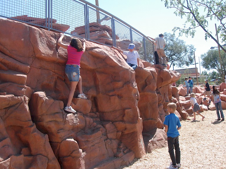 Another aspect of the western landscape is reflected in the park: a series of circular areas defined by stones, wooden walls or trellises recall the circular irrigated fields seen from the air as well as the underground chambers of Native American architecture. These all define gathering places in the park—from the grass picnic circles to the circular rose garden at one of the main entrances. At the center of the park is a gathering place defined by a ring of boulders that is also a children’s playground. There is a curved embankment that has a series of slides on one side with a climbing wall at the back. On the opposite edge there is a toddler’s area made up of circles of sand, grass and trees. An adjacent rock mound configured for an overview of the area also shows the water runoff pattern of a hilltop. A small stepped area for gatherings and performances as well as a stone labyrinth adjoin the mound. A field of posts and climbing nets occupy the area between the two edges of the larger play circle.