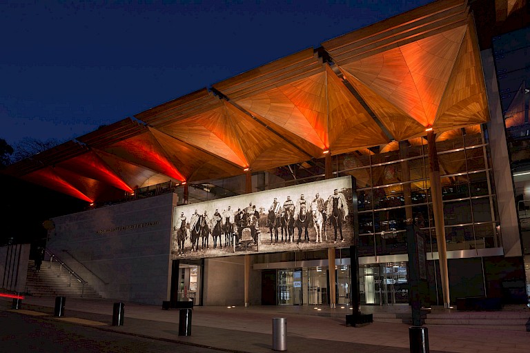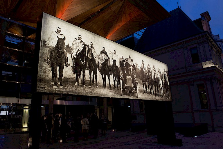 Nathan Pohio presented Raise the anchor, unfurl the sails, set course to the centre of an ever setting sun! on a monumental scale as an illuminated free-standing billboard. The art work reproduces a striking image - a photograph by C.J. Jennings documenting a historical event in 1905 which saw indigenous leaders meet representatives of the British crown. Ngāi Tahu leaders - ancestors of the artist - magnificently attired in full ceremonial dress and on horseback, flank the Governor of New Zealand, Lord Plunket, his wife, Lady Plunket, and others in their motor car. They are on their way to the Tuahiwi Pā (Māori village or defensive settlement) at Kaiapoi to bring the Ngāi Tahu land claim to vice-regal attention. On discovering the photograph Pohio was struck by the undeniable mana_ of the Ngāi Tahu leaders, and by how the image speaks of the Māori manaakitanga, or hospitality. Although Ngāi Tahu were in court with the Crown over land grievances at the time, Ngāi Tahu dignitaries had ridden out to welcome Lord and Lady Plunket who were manuhiri (visitors) to their lands and escort them to the marae (meeting grounds and focal point of the community), rather than waiting for them to arrive. To those in the car - the representatives of the Crown, and therefore of Empire and the vicious battle over Māori lands the English had in many cases had taken by force - Ngāi Tahu display their mana and uphold their cultural traditions including manaakitanga - the duty to host- to the people in the car. But there’s more at stake than just good manners or correct etiquette, there’s land at stake. As Louise Garret writes of the art work “Importantly, for Māori, the relationship between the land, the natural resources it sustains, and the people is not only symbiotic but familial: the land is regarded as a divine ancestor, a conviction that was recently recognised in settlements in which a river and a mountain in the North Island of New Zealand were granted legal status as human beings.” What followed this photograph was an opportunity for Ngāi Tahu to bring their land claim to the attention of the Crown. This is a historic moment, and a debate which is still defining New Zealand politics.