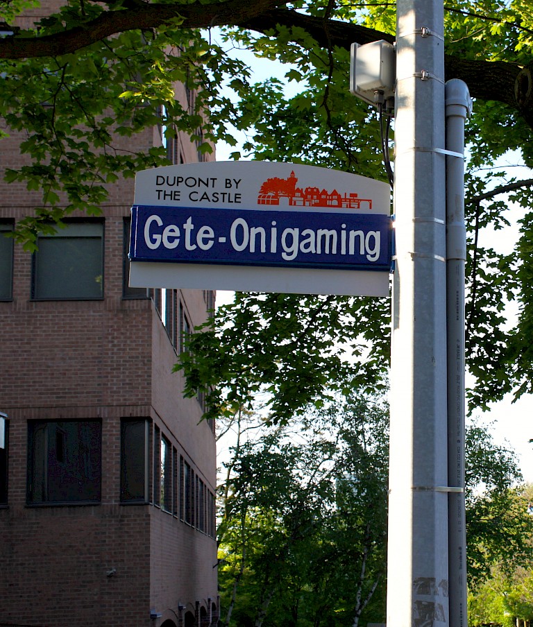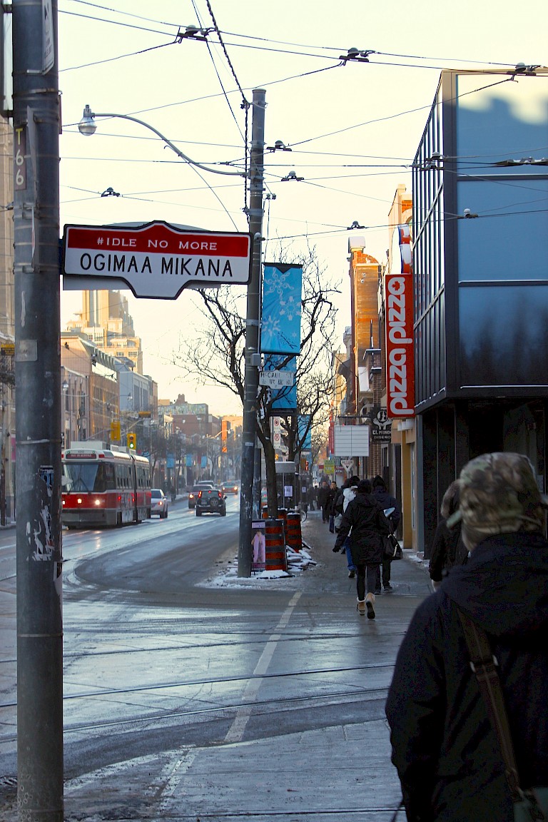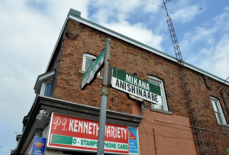 Ogimaa means someone who leads the people, and Mikana is a street, trail, or path—leaders trail. Their first work re-named a section of Queen Street West Ogimaa Mikana in tribute to the strong women leaders of the “Idle No More” movement, that both artists took part in. Ogimaa Mikana was also conceived of to introduce the revitalization of Indigenous languages, across Turtle Island, into the movement. Indigenous languages are all-but unfamiliar and unidentifiable to most Canadians with approximately only sixty active speakers. The Ogimaa Mikana project works against naming as a tool of colonial erasure.