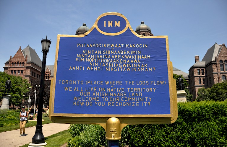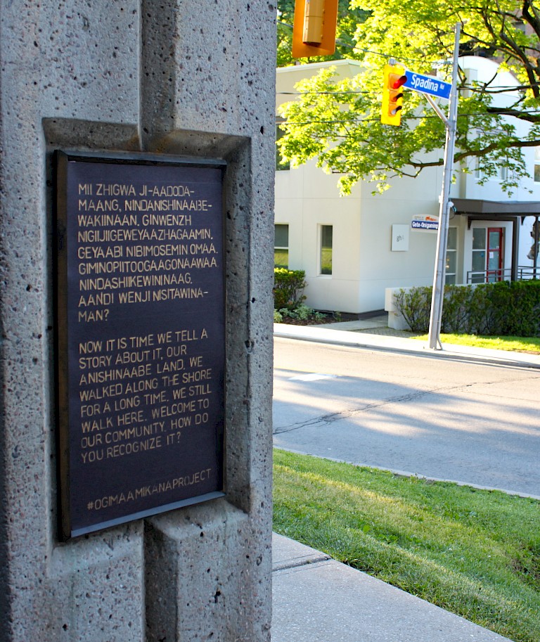The Ogimaa Mikana collective and series of works began in Toronto in 2013 and is now located across Ontario, Canada, Anishinaabeg territory. Reclaiming/Renaming, series of interventions, takes the form of billboards and imitation street signs and historical didactic plaques. Municipally installed street signs and historical plaques are intervened upon by covering the original text with decals, designed to have a similar aesthetic. Billboards are printed with Anishinaabemowin phrases. The artists’ first series of interventions were street signs that replace English street names with Anishinaabemowin ones. Historic plaque decals cover and replace colonial didactics offering prompts for thinking about the events of Canadian history in both Anishinaabemowin and English. Renaming/Reclaiming is meant to remind Anishinaabe people of their own heritage and remind non-indigenous people that this is indigenous territory with a 15,000-year history.