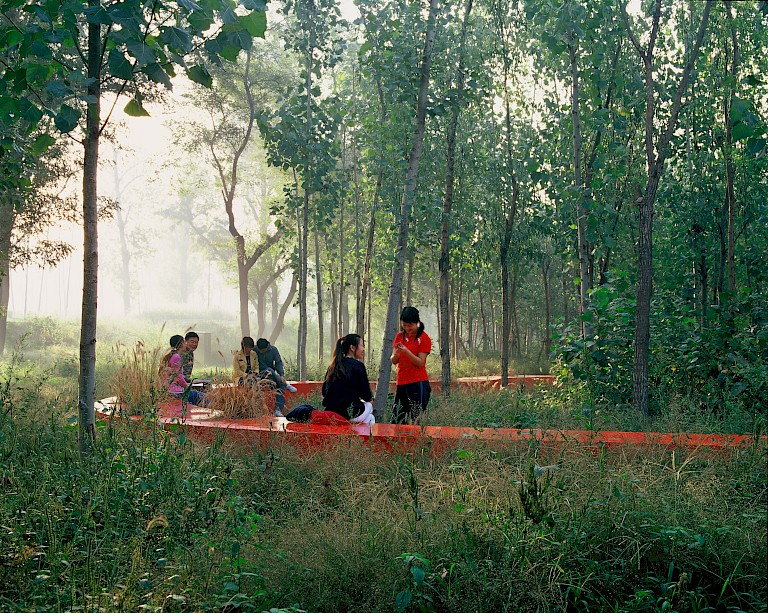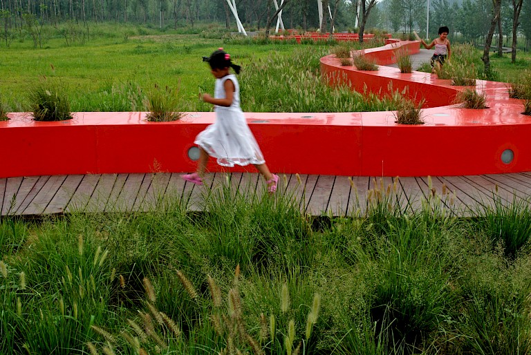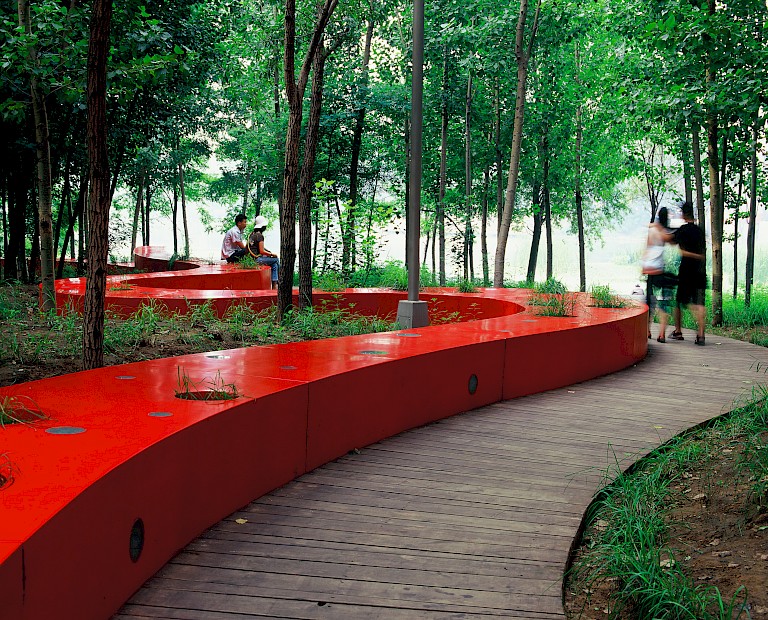 Based on the environmental conditions and in the context of the functional needs of the urban community, the first design priority at Tanghe Park was to protect the basic conditions of the water and vegetation. This meant strict protection of existing wetlands and strict protection of existing vegetation. Further measures called for the creation of biological berms in order to maintain the shape of the river and prevent its gradual erosion. The berms themselves were made from native species, both aquatic and wetland plants. Second, a continuous bicycle and pedestrian system was established. Bike paths and walking trails were created along the riverbank, connected with a road system making the area more accessible and secure. Third, an integrated seating, lighting and botanical viewing installation was created; called the Red Ribbon in the Green Forest, it weaves through the landscape along the forest line of the east riverbank.