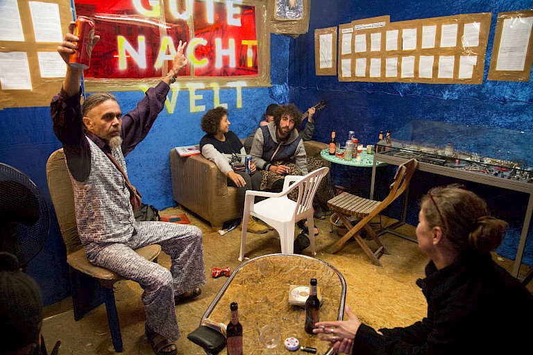 For his public sculptures and monuments he has a preference for everyday materials, a choice he describes as political,materials that are universal, economic, inclusive, and carry no other value then what they are (plastic sheeting, card board, aluminium, packing tape, magazine images) with which he creates dense site specific environments. The process of making remains visible and becomes a metaphor for the individual and collective struggle to establish democracy, always a process of making, never settled. The precariousness of his works defie the traditional sense of Monuments, usually in durable materials meant to commemorate for eternity. Instead, Hirschorns monuments made in and with local communities are not made to last. Rather than material durability it is the intensity and ideas that he wants to give a lasting life in the lives of people. Implicated in Hirschhorn's work, viewers are invited to reflect upon that which they sofar may have been able to ignore in their daily lives. More than a commemorations Hirschorn wants to show with his monuments that art and culture can have an impact, change life and endure. His sculptures are always build in places where people live and the preperation is a very important part of the work, in which he participates closely with local residents which he pays for their labour on his works. Posing the ideas of intellectuals and writers he admires in the middle of neighbourhoods of people who might never heard of them, the democratic notion and a strong belief in the transformative power of art is at the heart of Hirschorns work.