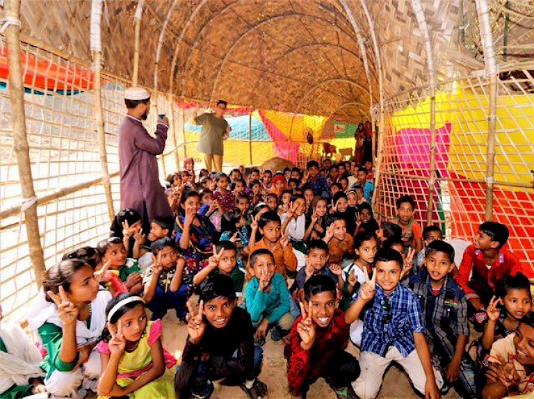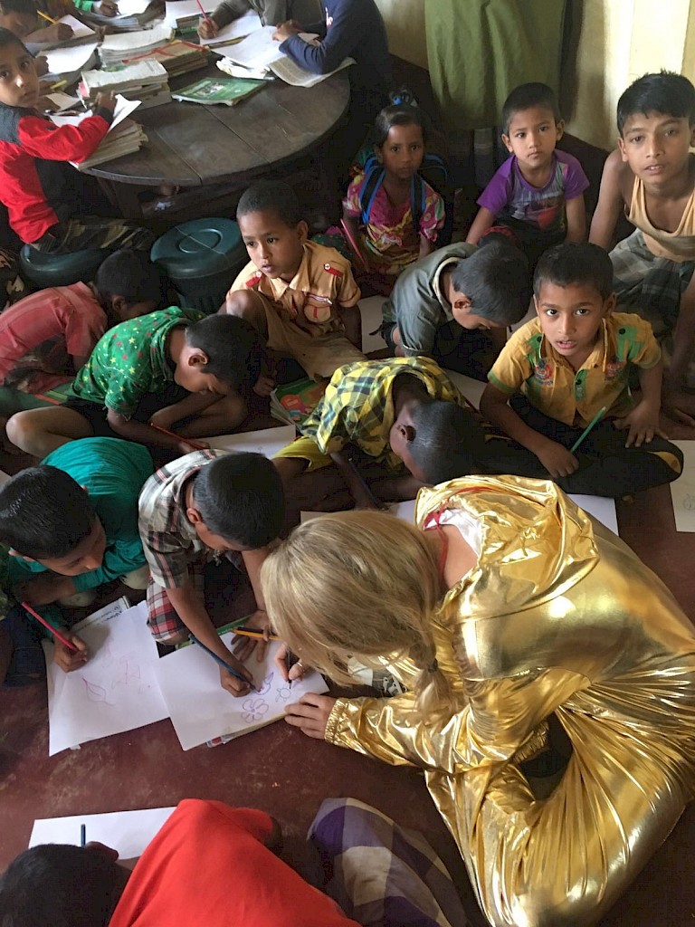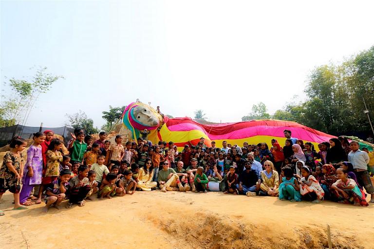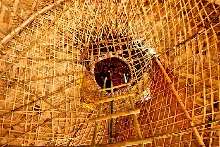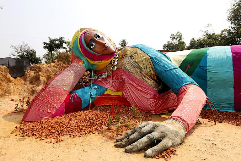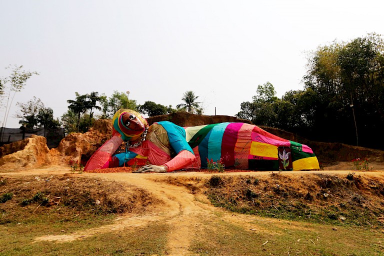 Rokeya is a monumental interactive sculpture created by Polish artist Pawel Althamer and ‘The Neighbours’ – members of his community back in Poland – at Bangladesh’s newly opened sculpture park – the Samdani Sculpture Park in Sylhet. Rokeya is a reclining woman – large enough for people to walk through and work inside - made of bright textiles stretched over a bamboo frame – built by Althamer, The Neighbours and 100 villagers and children from the area, along with patients of the Protisruti Drug Rehabilitation nearby. The sculpture houses a kiln and a community space for interactions with locals as well as workshops, exhibitions and other community activities. Since it’s completion in March 2017, the sculpture has engaged large numbers of local school children and community members and continues to remain a collective space for art and public engagement.