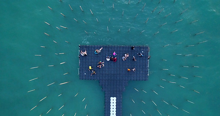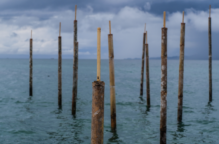 The project was a tribute to the perseverance of those communities. Simultaneously, working with students from the Baan Khlong Muang school, the artist organ-ised a workshop to enable each of the students to make their own bamboo flute. These devices will be used to generate a sound composition for a bamboo-flute orchestra/ installation, played by the waves. The project devised by Blume and the students conceived an imaginary narrative about a creature that could come from the sea to help humans to fight climate change: the installation is a call to listen to it singing, it screaming, while it tries to stop the waves. During a musical performance, the children play their flutes on the beach to call this being. This aspect of the work was recorded by Blume as a short film that accompa-nied the site specific sculpture. The children’s flutes produce a low monotone dirge not dissimilar to the sounds one hears around ports and foghorns. The bamboo flute orchestra/sculpture emits an undulat-ing dirge based on the frequency of the waves and the strength of the tides, the sound it produces gives vo-calization to teh imaginary sea creature, while also sounding like dozens of injured animals, like seals or dolphins trapped in a net. The resulting sounds are somewhat chilling.