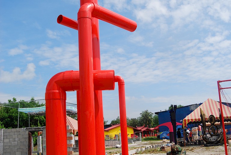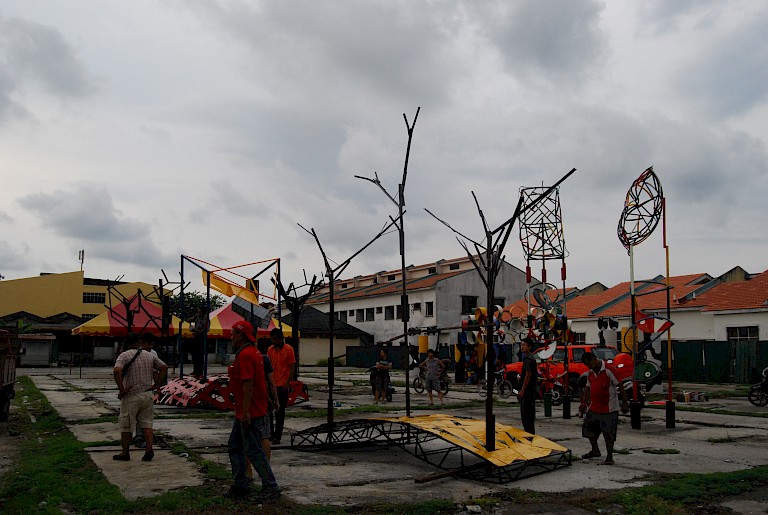 They had used local school, S.R.J.K (Chung Wah) the only school in Sasaran, as their significant venue for their activities. During the event, the classes were used by the artists as their studio in developing their art work. Another significant feature of this event is how the community members were able to accommodate the artists involved to stay at their properties without charges. Furthermore, it has become some sort of basic module of the Sasaran Festival. At the beginning, local community members were paying little attention even sceptical with the event. They consider that Sasaran were not a place for art and that art are belong to the big cities such as Kuala Lumpur. In order to socialise and nurture the appreciation towards art amongst the community member, Ng Bee created an educative workshop to introduce the basic of art within 2 months’ time. Their responses towards the festival began to change as the artists started to prepare their work, which they develop the curiosity about the artists working process. Later the community member began to develop their interest in assisting the artists by providing their manpower, material, event they suggest the artists to use recycle material found in Sasaran. Ng Bee saw this experience as a potential of the community further engagement towards the festival. The community themselves have their own pride by getting involve in the art making in particular, as it served a good way in promoting their hometown. They even voluntarily contribute their power and working hours in order to assist the artists without expecting material benefit in return. Other contribution they made including skills in logistical preparation, art assistant, handlers, material sourcing and assisting in fundraising activities. For the 2011 festival, they appoint a shop house space owned by a community member to become a meeting space and formed team role that divided into each leading area such as media, programme and logistic. Later each leading team working with smaller project teams from the community member which consist of 100 people in total. As for the artists that get involved in the festival, it is an opportunity for them to associate and see different artistic development from other part of the world. During the festivals visitors were also able to interact with the artists and their practice, which is another way of using art in reaching people that were foreign with art before.