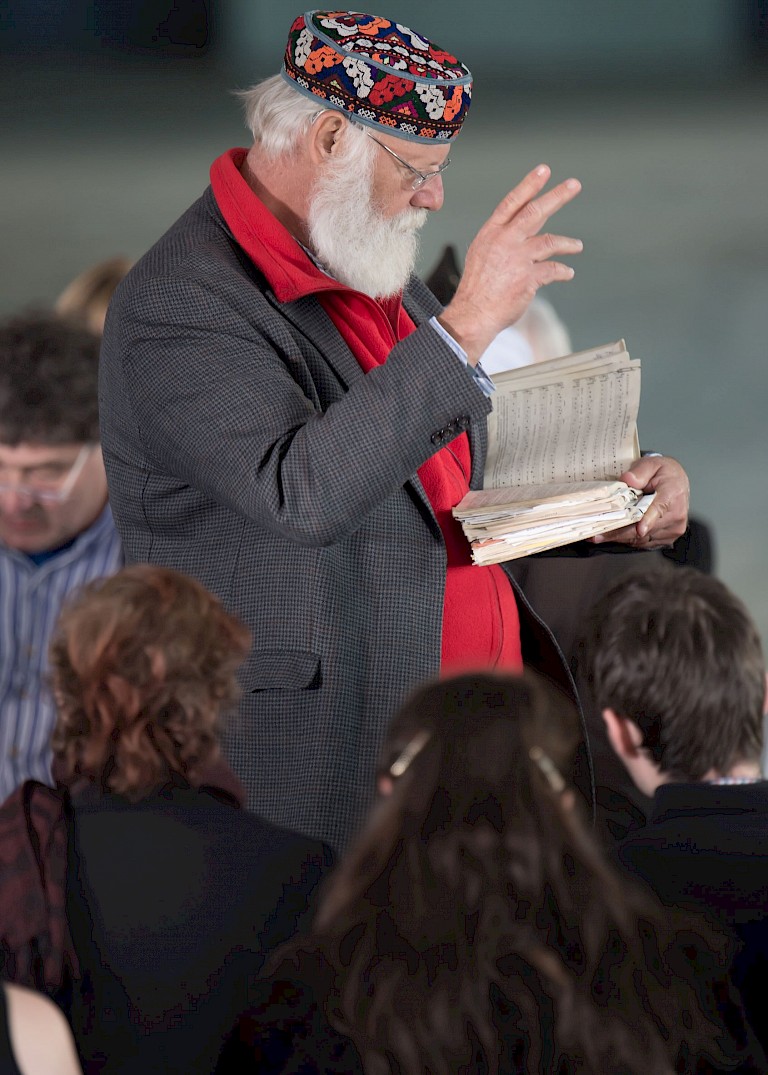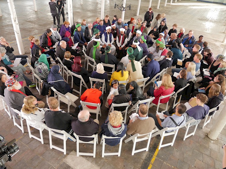 The community meetings which shaped Shapes of Water - Sounds of Hope provided a safe place to connect and have critical conversations across a growing cultural divide. However, beyond the re-establishment of dialogue, cooperation, and shared space, the project allowed something more to be generated, something less tangible but exceptionally powerful. In working with vocal traditions that facilitate congregational singing, Suzanne Lacy captured non-verbal ways of creating cohesion. Participants in Shape Note are seated in a square around which the four vocal parts - treble, counter, lead and bass - sing with one another and to one another, rather than facing outwards to an audience. Similarly, Sufi chant is sung in an inward facing concentric circle, with the intention to let human diversity be subsumed in unity and concord. Yet still, beyond these physical formats, the role of voice and music to connect people is key to Shapes of Water - Sounds of Hope.