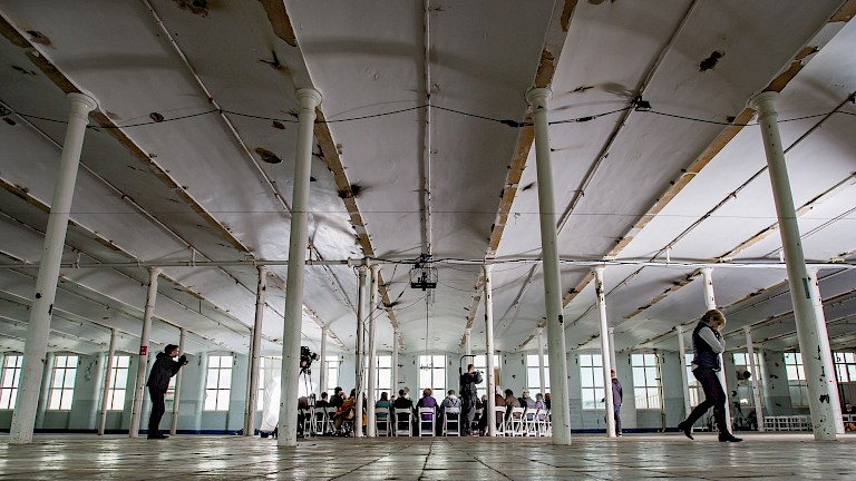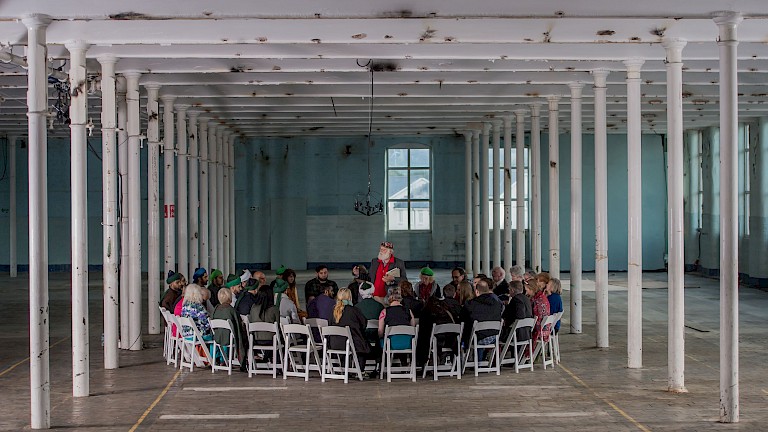 The art work was a response by Lacy to bridge history, culture, and identity through re-building community relationships and restarting conversations about public commons. Lacy and her collaborators worked closely with the community in a series of monthly meetings and singing sessions, exploring the history of the former mill, area, and local vocal traditions.[3]_ Shapes of Water - Sounds of Hope took inspiration from Shape Note singing and Sufi chanting, both centuries old traditions of civic and religious expression. Shape Note has strong roots in Lancashire, while the Middle Eastern Sufi tradition is commonly practiced by Pendle’s Muslim community. “I have wanted to work with shape-note music for about 15 years” Lacy commented. “…It is class-reflective, it’s embodied, it’s highly participatory, its structure is democratic, and it’s quite visceral.” An open call for participants across the multicultural community created a group to learn Shape Note and Sufi singing together over a two year period. Music is one of the most powerful conveners of unity and collective emotion, however its ability to unite can often supplant dialogue and gloss over important issues. To counter this a regular format to the meetings was established - learn to sing together, then eat together, and talk together about critical local issues. The result was a new artwork, culminating in the three-day event at the mill.[4] To document the journey and culmination of the art work, Lacy and her collaborators produced a film featuring local residents, interviews with former mill workers and their families, and performances of Shape Note and Sufi chanting during the three-day event.[5]_ One year later in September 2017 the community were again welcomed back to the mill, a symbolic remnant that defined Pendle’s landscape and the lives of its people.