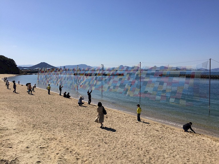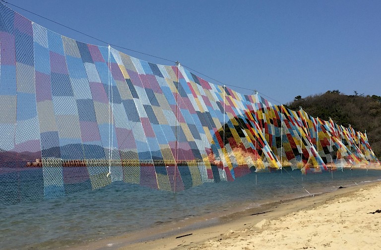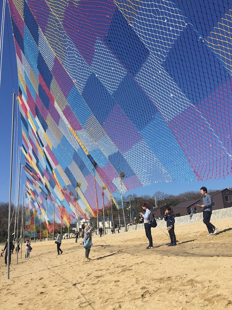 “Sora-Ami : Knitting the Sky” — Shimameguri” was created in “Art Setouchi 2016”. Setouchi, where the art festival took place, is an inland sea around Shikoku, which is one of the four main islands (Hokaido, Honshu, Shikoku, Kyusyu) of Japan islands. This work was based on Yoshima Islands, a group of the many small islands in Setouchi inland sea. This work was done with the help of people from the five islands, Shamijima, Seijima, Yoshima, Iwakurajima, and HItuishijima. These islands were significantly affected by the constructions and land reclamations to connect Shikoku and the Mainland for 10 years from 1978 to 1988. The artist said in his blog that “although the islands are connected by bridges or located next to each other, each island and islanders have their unique characteristics.” He decided to walk around islands and conduct the project of weaving fishing nets and eventually weaving them all together and installing it at the seashore where the tide shifts. “Sora-Ami : Knitting the Sky — Shimameguri” can be said to be a developed version of the project since the artist not only discovered the colors of each island and change the scenery, but also created a new type of communication line between the islands.