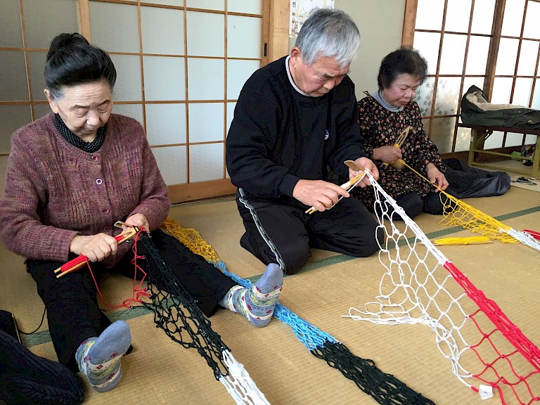 “Sora-Ami : Knitting the Sky” — Shimameguri is the developed version of “Sora-Ami : Knittiing the Sky”; a project-based work published in various regions, made in “Art Setouchi 2016” by an Artist, Yasuaki Igarashi. In “Sora-Ami : Knitting the Sky”, the artist himself goes around and weaves fishing nets with the local people. Through the process of weaving fishing nets, it spurs communication between the artist and the local people and communication among the local community as well. The fishing net that is weaved will not be thrown in the sea, but lifted in the sky of that region.