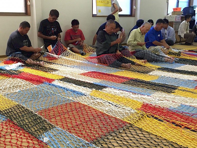 The hoisted fishing net will change the region’s view. In other words, it is a system to recapture the scenery. Since the fishing net is originally a tool used in the ocean by a fisherman, by carrying the technique to land, it creates a bond between fisherman and the local people. Therefore it is also an attempt to reweave both the relationship between the local people and the relationship between the scenery and human. Until now this work has been carried out in various regions in Japan after the artist encountered and experienced the life of a fisherman weaving fishing nets.