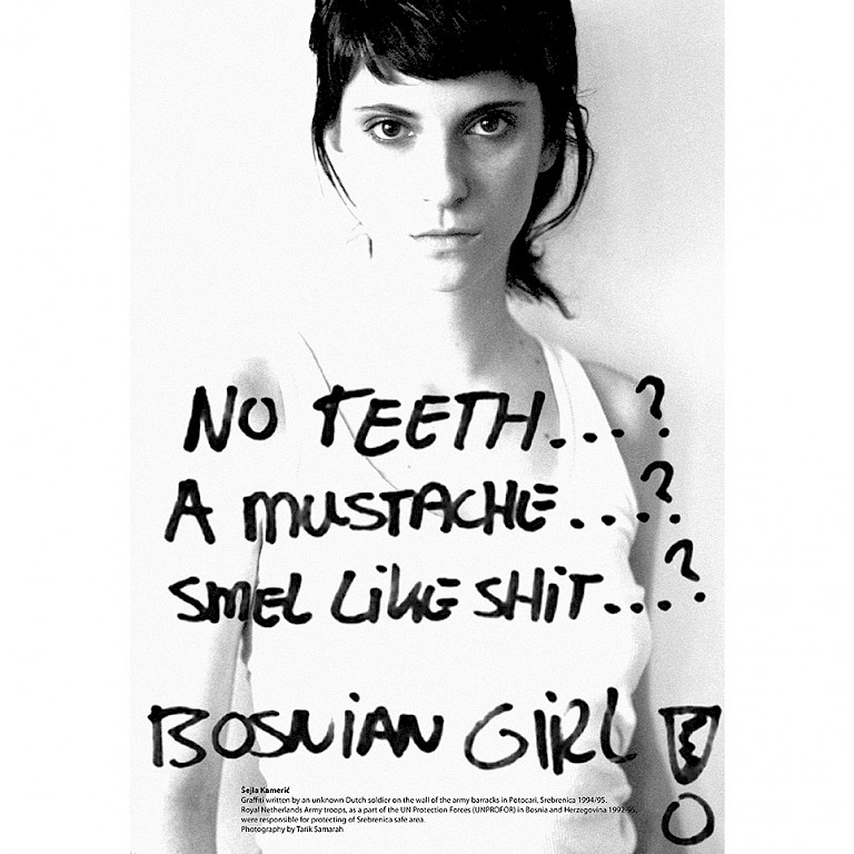 The most famous intervention from Bosnia Girl is a black-and-white fashion-style photograph of the artist by Tarik Samarah, which shows denigrating phrases about Bosnian women superimposed on the image of a strong young woman, who was Šejla Kamerić herself, looking directly into the eyes of the visitor. Samara was questioning the viewer's own reaction to these phrases which read: "No teeth...? A moustache...? Smell like shit... ? Bosnian girls!"