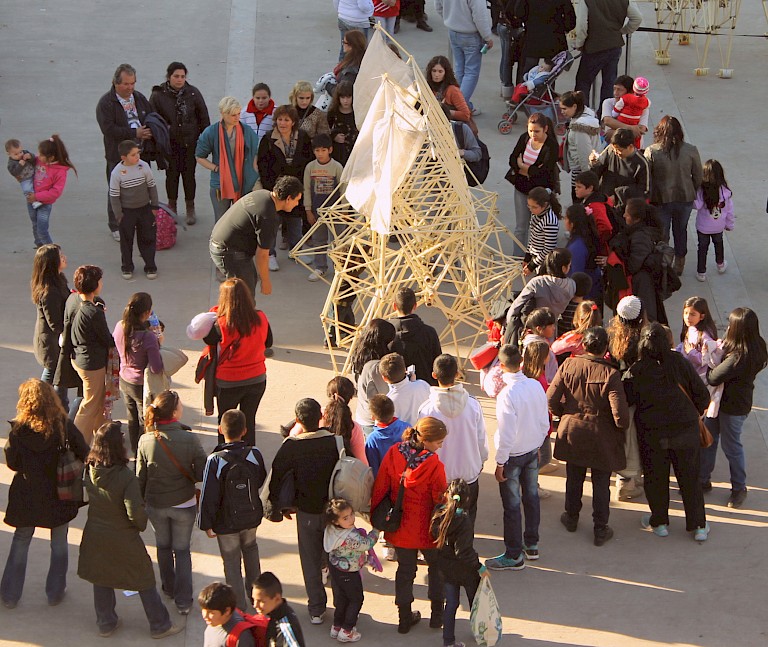Each of Jansen’s beasts takes approximately a year to create, and each new strandbeest improves on the previous version, with the artist implementing modifications in response to the difficulties encountered (e.g. withstanding storms)—a kind of assisted evolution. One iteration of Jansen’s strandbeest projects consisted of the installation of two creatures from a growing bestiary at Tecnopolis 2012, the largest art/science/technology event in Latin America. The two animals were Animaris Umerus and Animaris Ordis Mutantis, the former, a gigantic 12-meter in length and 4-meter in height, and the latter, closer to human scale.