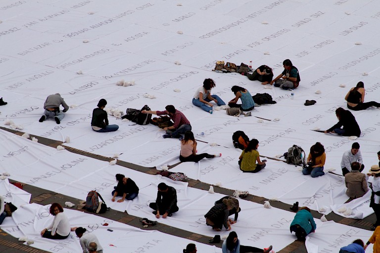 According to the Colombian website ‘Arcadia’ a rumour began at the Universidad Nacional (National University) in Bogotá shortly after the vote to reject a peace agreement was announced regarding Salcedo’s desire to create an artwork in response to the vote. Shortly after, an email was sent to the entire campus: “Doris Salcedo invites us to draw the names of victims of the decades-long conflict on seven kilometers of cloth and then put them together with needle and thread.” In response, thousands of volunteers from around the city gathered early on the morning of 6th of October 2016 in La Plaza Bolívar. Created in collaboration with citizens and in collaboration with the Museo de la Universidad Nacional, Sumando Ausencias (Adding Absences) took the form of a banner or ‘shroud’ across La Plaza Bolívar. La Plaza Bolivar has been the focal point for many of the city’s tragedies and triumphs. The Palace of Justice, twice rebuilt due to violence and attacks, stands there alongside the Cathedral and the National Capitol, which houses the government of Colombia. At this historical landmark, Salcedo worked with citizen volunteers to create Sumando Ausencias. Using 7,000 metres of fabric the protest camp inhabitants and other volunteers used ash to write some 2,300 names on white cloth. Gathered from the government’s Registry of Victims, these names represented only a fraction, roughly 7%, of the victims of Colombia’s civil war. Sumando Ausencias was an urgent and enormous artwork, created in just one week with the help of over one thousand volunteers. Once the names were complete on the morning of 11th October, Salcedo and the volunteers began to assemble the piece. Each sheet of cloth symbolising a death shroud was carried and laid down carefully by volunteers in a gesture of respect for the absent victims, then stitched together by hand over a period of 12 hours. Once complete, Sumando Ausencias covered the entire Plaza.