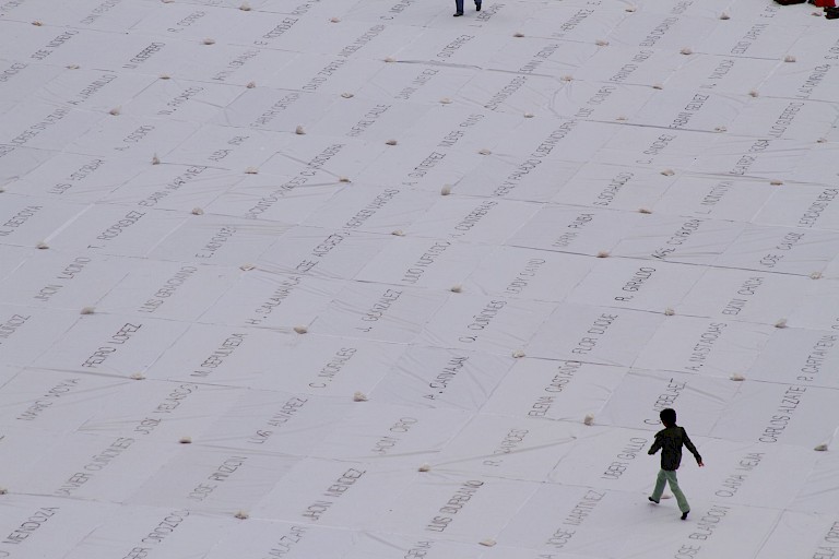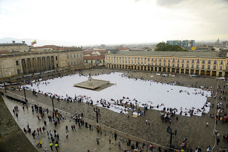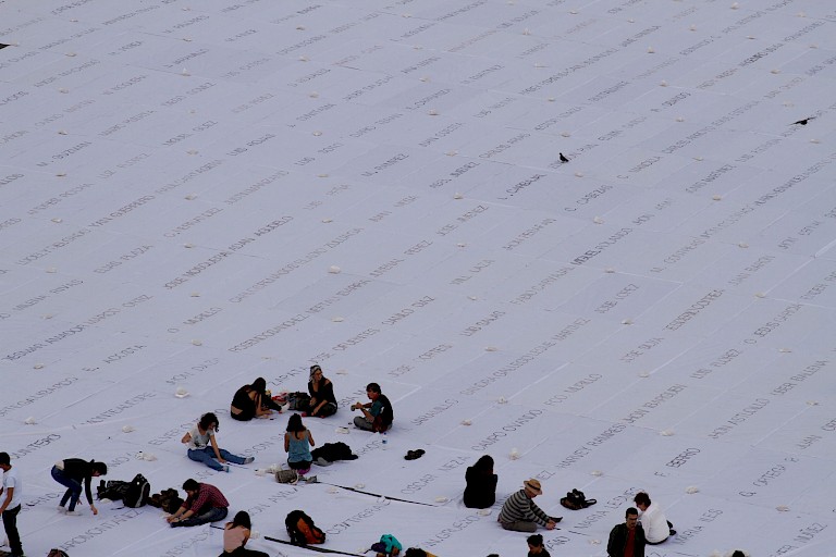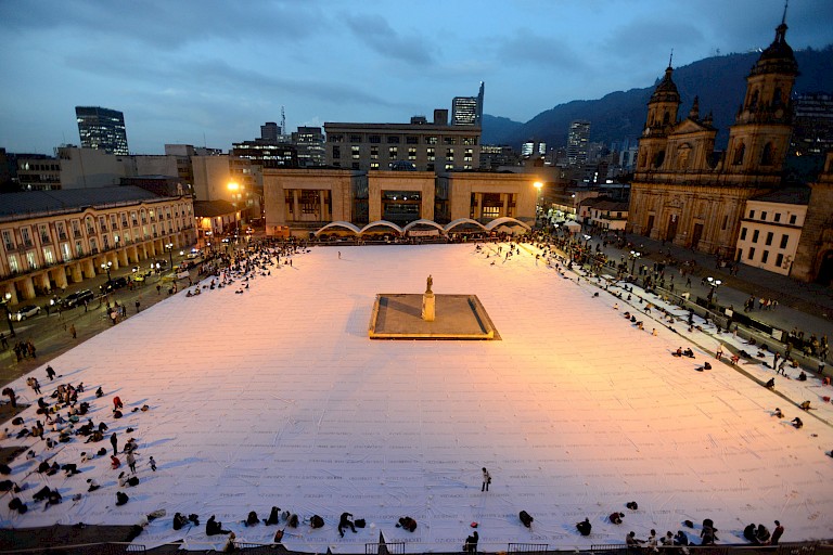 On the evening of 2 October 2016, the people of Colombia were faced with one of the most uncertain situations in their country’s history. After four years of negotiations between the government and the largest insurgent group in South America, the Revolutionary Armed Forces of Colombia (FARC), a small majority of the population — motivated by a long campaign led by the former President Álvaro Uribe — voted to reject a peace agreement that would have ended nearly 60 years of armed conflict and civil war. Peace was only denied to the people of Colombia by a margin of only half a percentage point. Public reaction was that of horror, many felt it was a devastating missed opportunity for peace. Fearing an imminent return to violence and understanding the dangers still remaining in such a volatile situation, tens of thousands of citizens began mobilising. In the days that followed two important initiatives responded to the vote and eventually came together: ‘Plantón por La Paz’ (campground for peace), a citizen-organised protest camp occupied La Plaza Bolívar (Bolívar Square) in the country’s capital Bogotá, and a public art installation by Doris Salcedo titled Sumando Ausencias (2016).