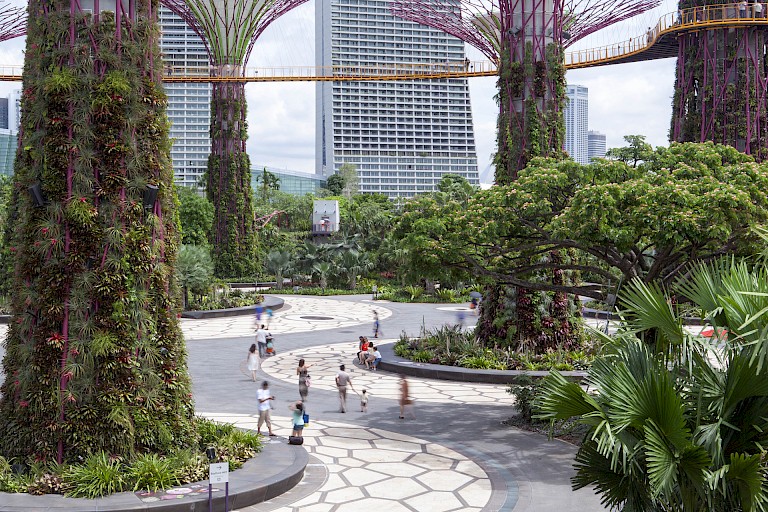 An increasingly important component of sustainable urban development in the twenty-first century is the incorporation of green spaces into densely built urban areas positions, and this project exemplifies current thinking. Both the urban and the natural have been carefully considered in this development. Singapore is a small island with land restraints and high-density urban living. The island state is famous for its bustling city attractions and shopping but is also surprisingly green despite urbanization. The Supertrees installation extends this paradox further.