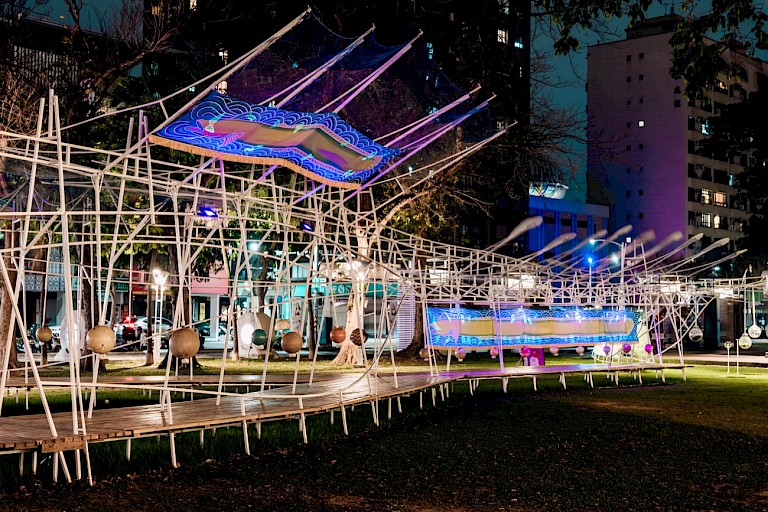 "Swirling Echoes of the Eel" is not only an art piece but also a spatial installation filled with structure and cleverly conceived movement lines. This installation incorporates several outcomes from the art participation project "Replay the Ocean: Sound Form, New Ecological Wave": the large fishing flag printmaking workshops from the surrounding areas of the Kaoping River basin (Linyuan, Daliao, Dashu, Qishan, Meinong, Liugui, Maolin, Namaxia, Taoyuan District), the sound collection workshops in Yanchao, Dashe, and Renwu Districts, and the musical creations from two "Creative Action Plans" - the collection of fishing songs from Kaohsiung's Qijin District and the body project in the Yancheng District. These parts, some completed by artists from different fields and some by the public, were re-created by artists and assembled on "Swirling Echoes of the Eel," making it not only a work that spans contemporary visual arts, architecture, cultural geography, traditional crafts, and sound art, but also a collective creation filled with collective memories.