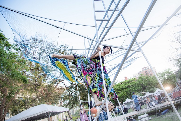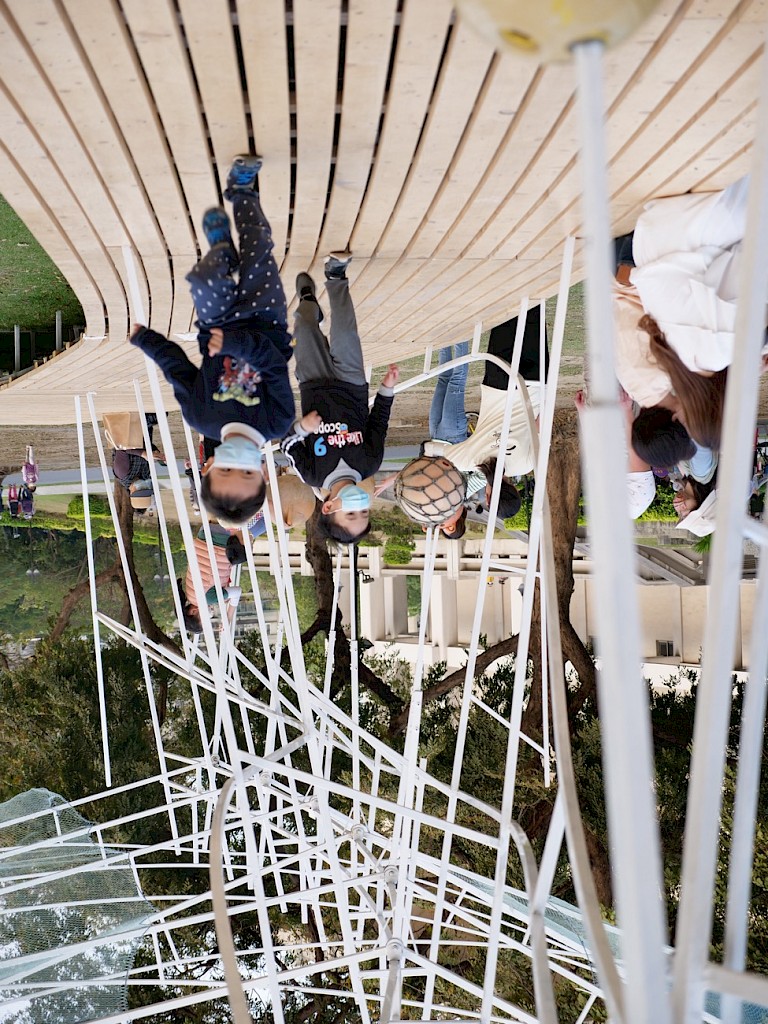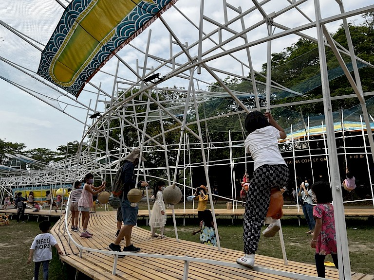 The Kaohsiung Cultural Center, where ""Swirling Echoes of the Eel"" was installed, is a bustling place on regular days. Although there's no official statistical data, during the installation period, at least several thousands to tens of thousands of people must have viewed the artwork and understood the project's essence through the text on the installation. Especially in the evenings and on weekends, parents often accompanied their children to play around the artwork, with dozens of children frolicking on it at peak times. Generally, Kaohsiung is not a city that frequently holds large visual art events, and participatory public art is even rarer. ""Swirling Echoes of the Eel"" can be described as a rare, joyous, and culturally rich art feast for all Kaohsiung residents in recent years.
