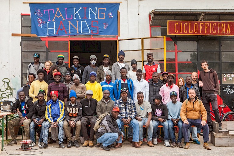 The core group of Talking Hands is made up of 15 people who run workshops, as well as around 50 people who temporarily reside in the space. Despite the decrease in arrivals following agreements between Italy and Libya in 2017, Italian reception centres remained vastly over-crowded (Urettini, Mc Carthy, 2020).[1] Urettini reports that, upon arrival, most asylum seekers are accommodated in former barracks that serve as reception centres.