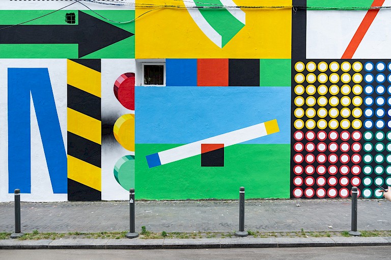 Lost.Optics and Pren were selected to build a fresco dedicated to poetry hidden among the streets of the city. The work, The city is the message, which was live on Verona Street for a year, is composed around the idea of a dynamic urban space, with multiple meanings, a city that speaks subtly to us, through its forms and compositions. The concept is found in the elements in the mural, taken in chromatic extremes, formally distorted, but specific to the metropolitan universe: a slide, a traffic sign, architectural details, lights indicators, letters, "nodes and signs". In their monumental collage, the city is not just a setting, but also an actor of our daily lives, one that deserves to be admired and thus revalued.