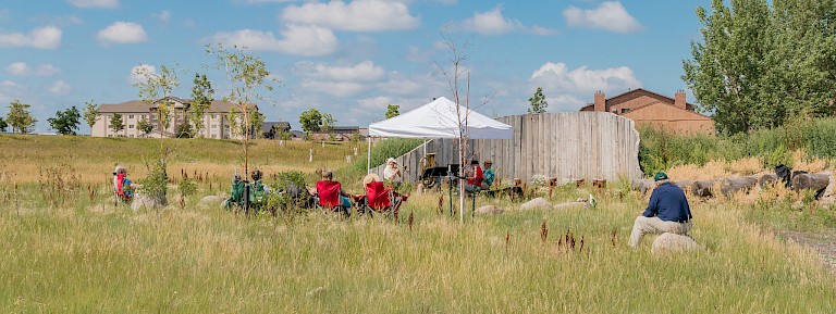 World Common Gardens is the transformation of an 18-acre storm water basin into an ecological community commons. It is the first installation of the Fargo Project to demonstrate how holistic ecological restoration, socially engaged ecological art, and active community process can synergize to transform functioning storm water infrastructure into a vibrant multifunctional green space for the Fargo community. It is also a pilot site which tests the methodology of the Fargo Project – a unique way of engaging the community in the visioning of their shared urban spaces, and becoming change agents for their neighborhoods. This community engagement strategy and collaborative effort brought together artists, community members, children, adults, landscape architects, city planners, and ecologists to transform their city together, and can be replicated on other projects throughout the city.