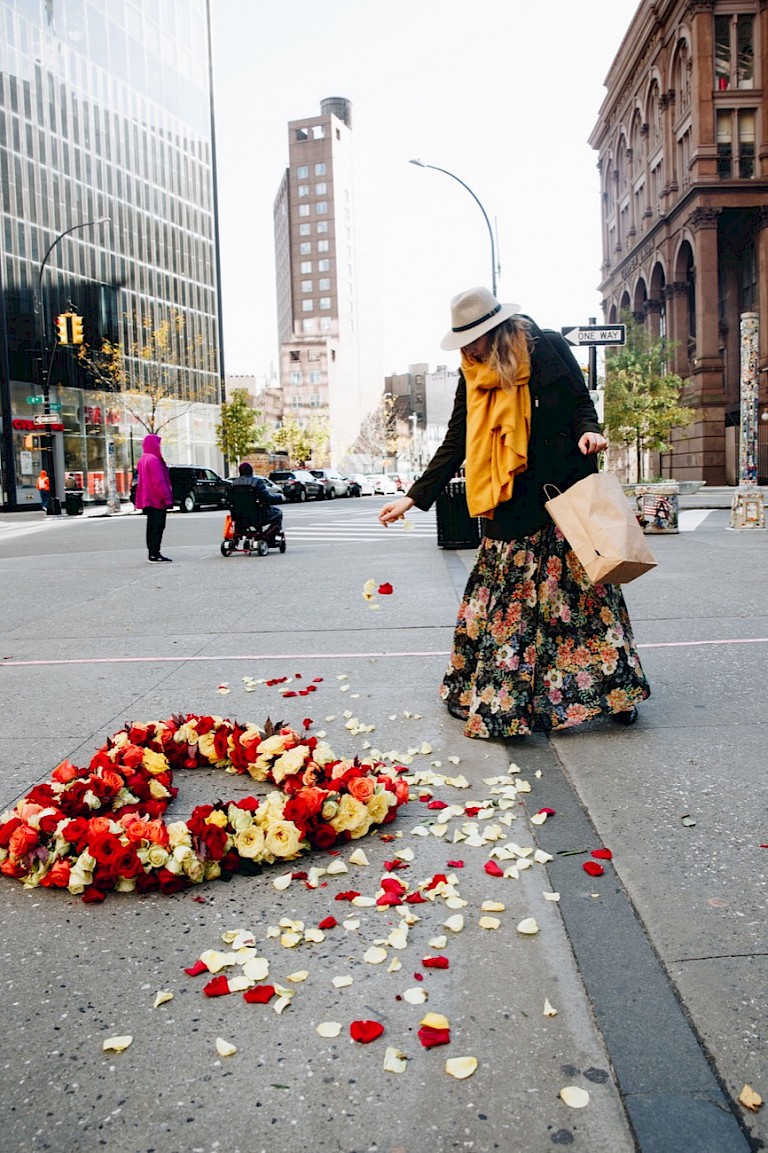 In those early days of the pandemic, it was hard to get access to resources. But, in New York but there were still flowers being delivered daily to my neighbourhood grocery store and I had at one point long in the past been a florist. So it was a material I knew how to use. But, more than the available medium, they had a historic symbolism in the grief and burial communities. Flowers have been found at grave sites going back at least ten thousand years. It was a nice synergy of my skills and resources.I played around with a few iterations before landing on floral hearts which I created using an intricate floral weaving technique. The hearts were a visually simple symbol of our love for each other that could resonate in any language. And, they were temporary lasting around seven days or the length in which most religions and communities recognise our grief as being at its most intense. Each heart is made of at least four-hundred flowers and each flower is meant to represent someone we lost. The hearts are then curated site-specifically to make the most impactful impression.