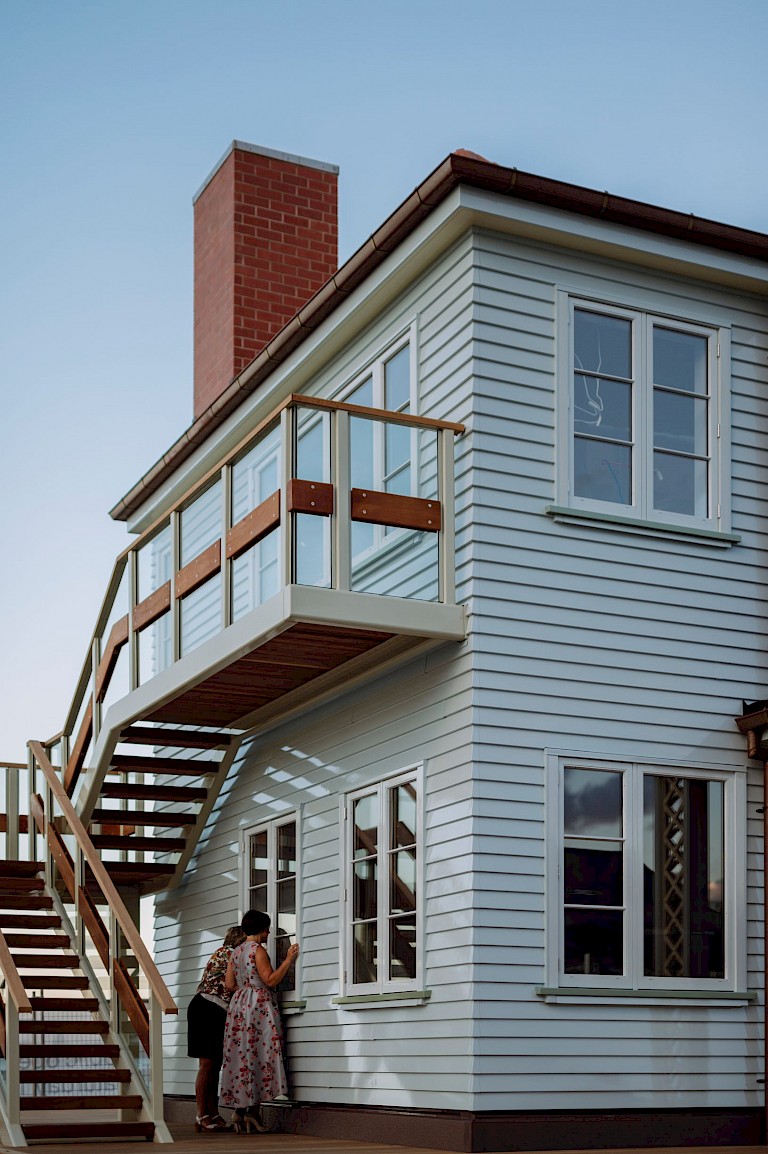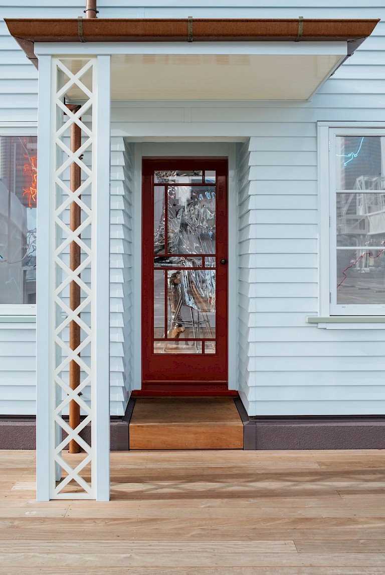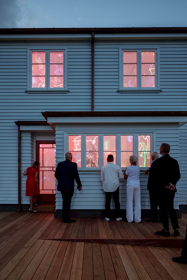 The interior of The Lighthouse: Tū Whenua-a-Kura explodes with colour from neon light installations of Southern Hemisphere star constellations covering glossy walls and scattering light over a reflective sculpture of 18th century British explorer Captain Cook. The artwork sits on a low wooden jetty, the public cannot enter the art work but can look through windows and doors and climb the staircase that leads to the second storey of the structure. Shutters frame the windows (an architectural divergence from actual state houses) featuring chevron patterns that reference the traditional tukutuku panels in a Māori meeting house and common warning signs. The interior floor is native timber, a reference to the flooring of original state houses and to the decks of sailing ships that brought Europeans to this land.