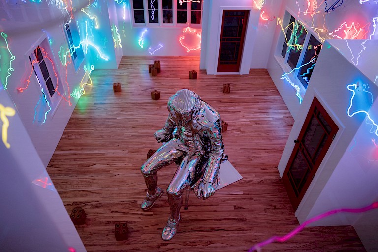 The Lighthouse: Tū Whenua-a-Kura (2017) by Michael Parekowhai is a 1:1 scale sculpture of a quintessentially 1950s New Zealand home. Parekowhai received the commission from Auckland Council after a real-estate company offered one million New Zealand dollars for a public sculpture to celebrate their 90 years in business. The artist’s concept was to erect a structure in the instantly recognisable style of what is known locally as a ‘state house’ or public housing. The sculpture engaged public and media attention in unprecedented ways, not only for its form but also the story behind how it came into existence. While early media bluster promoted the false idea that the artist planned to transplant an actual state house, or that it was an art world prank, The Lighthouse: Tū Whenua-a-Kura is in fact finished with the highly polished literal and conceptual gloss of Parekowhai’s practice.