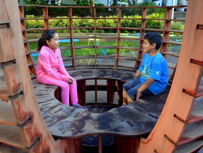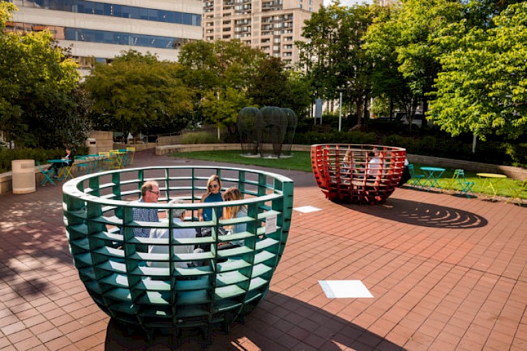 The Meeting Bowls are designed to generate a slight rocking motion as they rebalance when people step into and out. The gentle motion generated is intended to be relaxing and playful. Temporary and lively urban furniture encourages friendly dialogue between strangers in a close yet pleasant space. The meeting Bowls are part of a series of temporary public art projects title “Reimagine Civic,” which is a public art initiative in Arlington, VA, aimed at sparking public conversation about the future Courthouse Square by exploring the interaction between civic space and civic life in Arlington in the twenty-first century. In that context, the Meeting Bowls operate as a playful but practical artwork as the Meeting Bowls serve as a tool for public dialogue with the civic society of Arlington about participation in the creation of the new public space of the city.