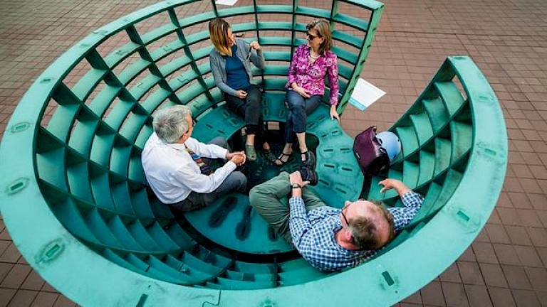 Meeting Bowls is a traveling public art project sponsored by Acción Cultural Española (AC/E), an agency that orchestrates public support to promote culture in Spain and overseas. Co-sponsored by the Spanish Cultural Center (CCE Miami). The Meeting Bowls is a traveling public art; an inviting semi-spherical capsules installed outdoors in spaces with high pedestrian traffic. The Meeting Bowls project began to be on display in the USA in Time Square in New York City, move then to Arlington in Virginia to finally arrive at Art Basel in Miami. Meeting Bowls are shaped like bowls with seating to accommodate eight people. The Meeting Bowls are social places for gathering, getting to know people, and fostering dialogue in small groups. They are designed to promote communication by having those seated inside face one another. These "social" benches are more intimate than typical public benches.