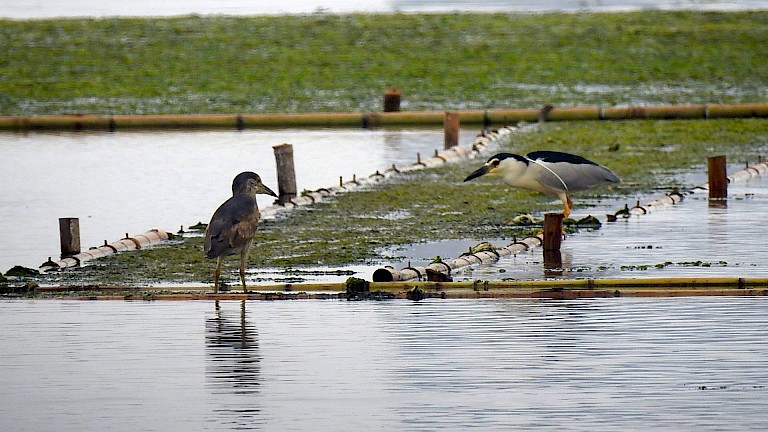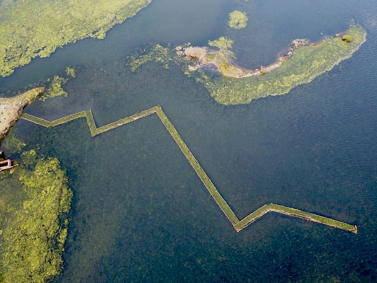 As a location for the The Microclimatic Life-line, the artists chose the area which was struck by the typhoon, where a crematorium with cremated remains of deceased victims which were buried in this area can be seen on the horizon. 'The Microclimatic Life-line' consists of eleven connected rafts made of bamboo and covered with algae. The rafts are made using traditional techniques using bamboo pen and hole joints; were were trained to usethis technique by a local 'bamboo master'. On frames, strips of split bamboo were knotted with the help of villagers and various school children. The result is a biodegradableart installation that will disolve slowly into the Wetlands. During the opening, visitors received an explanation of the artwork and were invited to join the 'Algae Experience'.