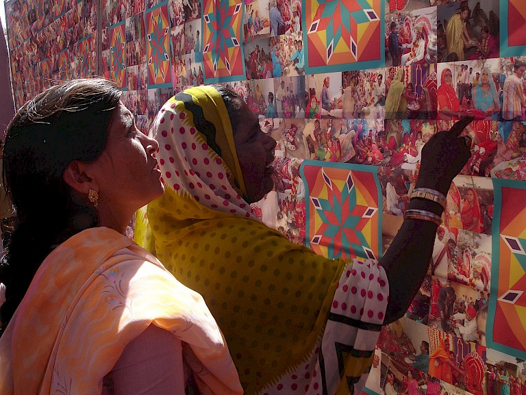 Another strategy to invite community discussion was Upadhyay’s design of the shamiana’s cloth. The tent walls are typically printed with ornate designs and beautiful scenes, but in this case, Upadhyay printed photographs collected from local resident’s wedding albums. As a result, the choices, traditions, and caste differences of the area were highlighted in a humanizing and aesthetically pleasing manner. Villagers enjoyed finding their old photographs reproduced—and the juxtapositions allowed further conversation and reflection on the local traditions.