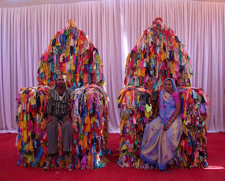 Equally importantly, the collaborative nature of the project gave the opportunity for sharing and engagement with the subject matter of the piece. In particular, Upadhyay enlisted “a group of community women to help build up the structure” of the piece, says Upadhyay. During this construction phase, the women “developed relationships of friendship and exchange through long conversations sharing their experiences with marriage and the issues related to it.”