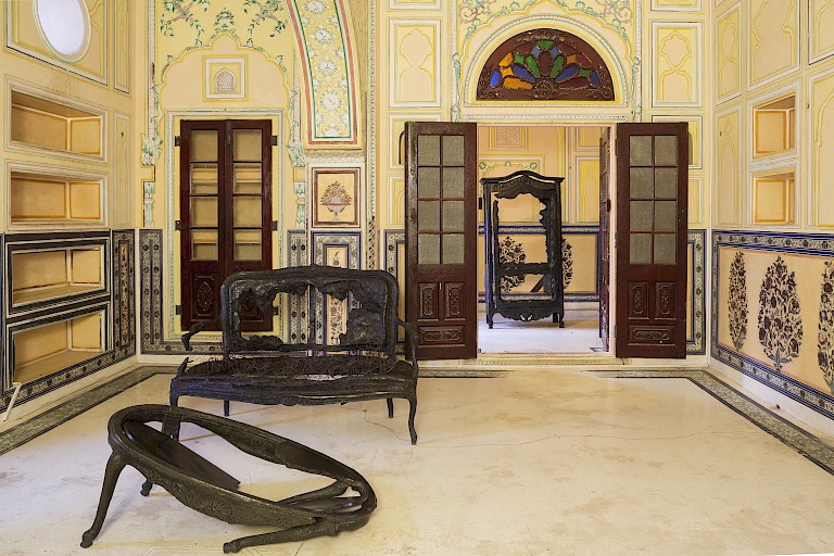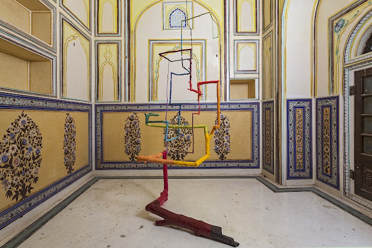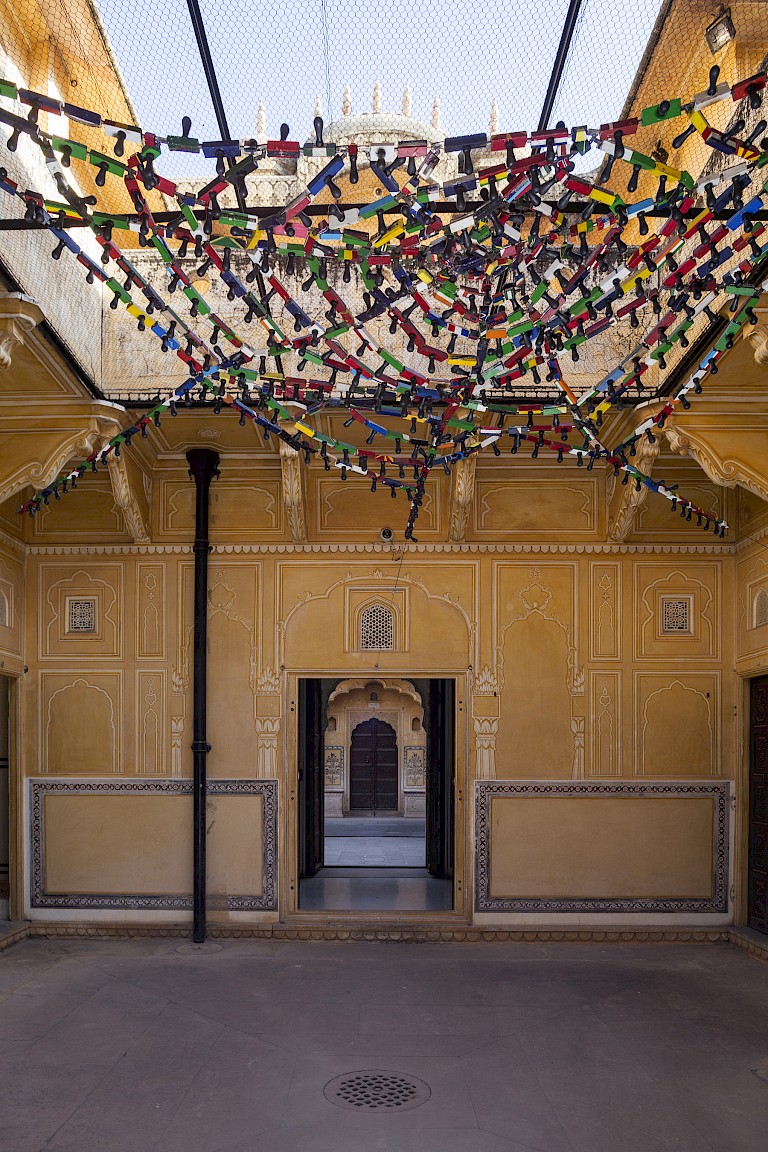 The site, Nahargarh Fort dates from the 17th century but today is not more than a rambling series of walls, a step well, and a few other structures. Inside the Fort, the Maharaja of Jaipur built a small palace in the last decade of the 19th Century, to house part of his harem. Madhavendra Palace was conceived and built as a cohesive project and in some ways resembles a modern apartment building. Nine identical duplex apartments surround a central courtyard, with connecting hallways and those on one side have sweeping views across the city of Jaipur. The walls of the palace have extensive paintings throughout, which were executed at the time the palace was built. The Fort and the Palace within it are property of the Government of Rajasthan and have been open to visitors since the 1960s. Not as popular as the more well-known Amer Fort (approximately 5 kilometers away), Nahargarh Fort receives up to 6000 visitors a day during high-season (November to March) and the Palace was also open to the public, hence security, electricity and water were already in place. The palace served our purposes as most of the spaces were enclosed and it already had many visitors coming, mostly Indian tourists visiting Jaipur and some foreigners, most of whom were unaware of contemporary art in any way. As the site itself is a landmark heritage structure in Jaipur, by placing contemporary art works inside, the organizers hoped to create links between the city’s past and its present.
