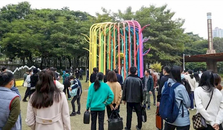 More and more sustainable public art projects are emerging in China's non-central cities, suburbs and even in the countryside. This is partly related to the growing desire of art organizers to find new ways for making art happen, and partly related to the expansion of the region's cultural and artistic ecology. The Nanhai Public Art Exhibition was born in this context. The venue of the exhibition, Qiandeng Lake Living Water Park, has established a harmonious interaction between human beings and the natural and human environment. The Qiandeng Lake Living Water Park is a product of the city's beautification planning and construction, with a clear and explicit function, i.e. as a rare green ecological landscape in the city for the public to move around and rest, so that they can have a better living experience. The exhibition well integrates public art with the local environment, and symbiosis with the landscape. The term "symbiosis" is originally a concept in the field of biology, used by urban sociologists to describe the relationships formed by groups of people in a fixed location, and later extended to the interdependence and balance of things in a larger spatial context.