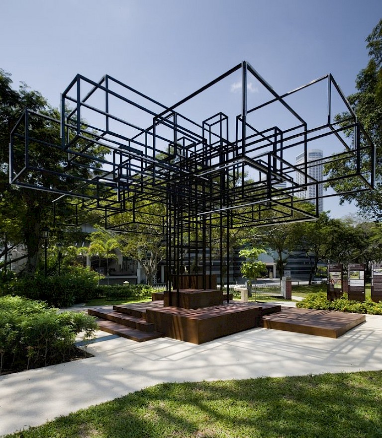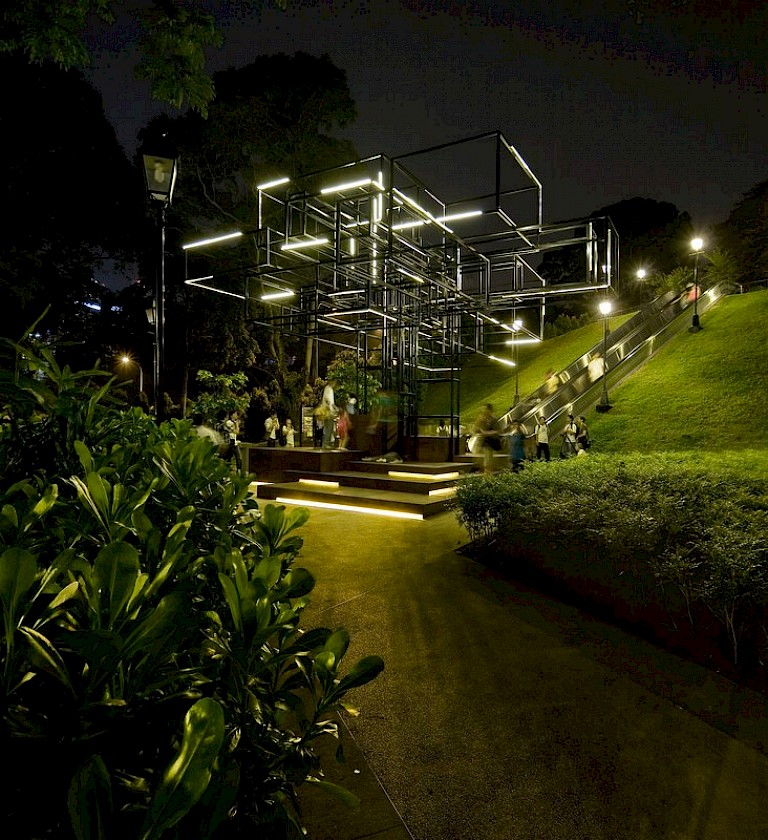 A tiny republic of just over 700 square kilometers, Singapore is a rich ethnic and social stew and buzzing, dynamic, globalised urban hub that comes alive at night. Responding to the nocturnal culture of the city-state but also creating a deeper, more spiritual dimension and metaphor, The Tree lets Singaporeans connect to their social and local history. Though its form may be urban, contemporary, and angular, the sculpture unfolds many layers rich with meaning and nuance.