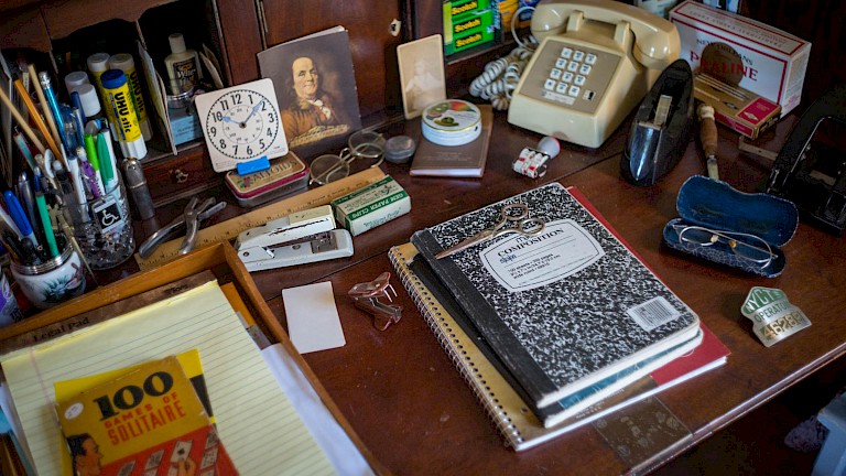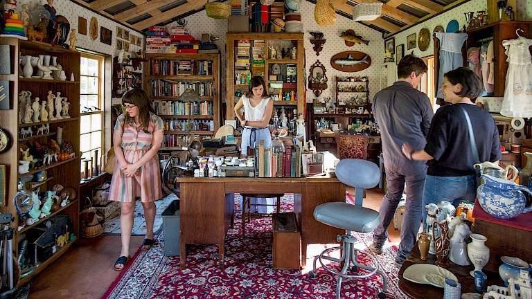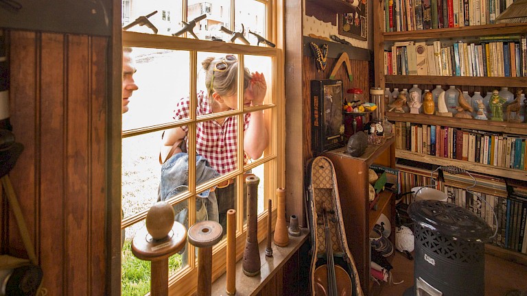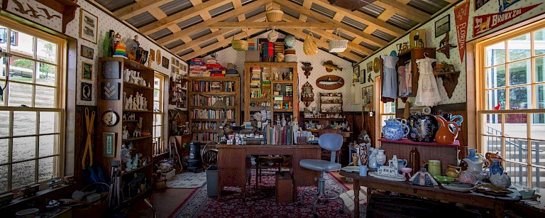 The Virginia Curiosity Shop consists of a well-crafted, aged vernacular structure –like a house--, a recognizable architecture and type of construction for the area that gives the impression of having been located on the site for decades. The modest building is a small and simple wooden building, with a tin roof, a porch, and small glass windows that resemble countless structures dotting the rural landscape of the state of Virginia, appears as a strange remaining building miraculously untouched by the modern era, visibly contrasting with the modern building of the university in terms of construction and scale. With its diminutive stature, tin roof, multi-paned windows, and weathered gray siding, the building appears humble and amiable. Nothing on the exterior prepares visitors for the visual feast they will encounter when they peer through its low windows and ascend the porch to its viewing vestibule to see the building’s interior. The vision of the interior greeting the public is one of shocking material excess, wonder, and beauty, triggering a series of questions on the audience about the collection, its origins, and meaning. Asking the audience to see past the clutter and into the creative manifestation of the display requires an active imagination on the viewer’s part.
