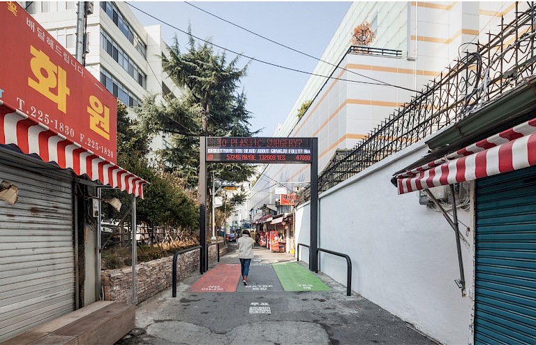 The work is shaped like a door frame and spans the entire street. Whether pedestrians or non-motor vehicles, it is inevitable to pass through one of the lanes marked with color. And each ""passing"" will be recorded by the sensor above the head and become part of the cumulative count. Therefore, whether intentionally or unintentionally, everyone becomes a participant in the voting. This seemingly passive form of participation creates equality and democracy among participants. While politically relevant voting still involves qualification checks (e.g., qualifications as “citizen”, or “resident” of the place), the artwork Vote truly addresses all those who live in the city and cross the street as voters, regardless of nationality or background, making “participation” a natural attribute and automatic involvement for everyone.
